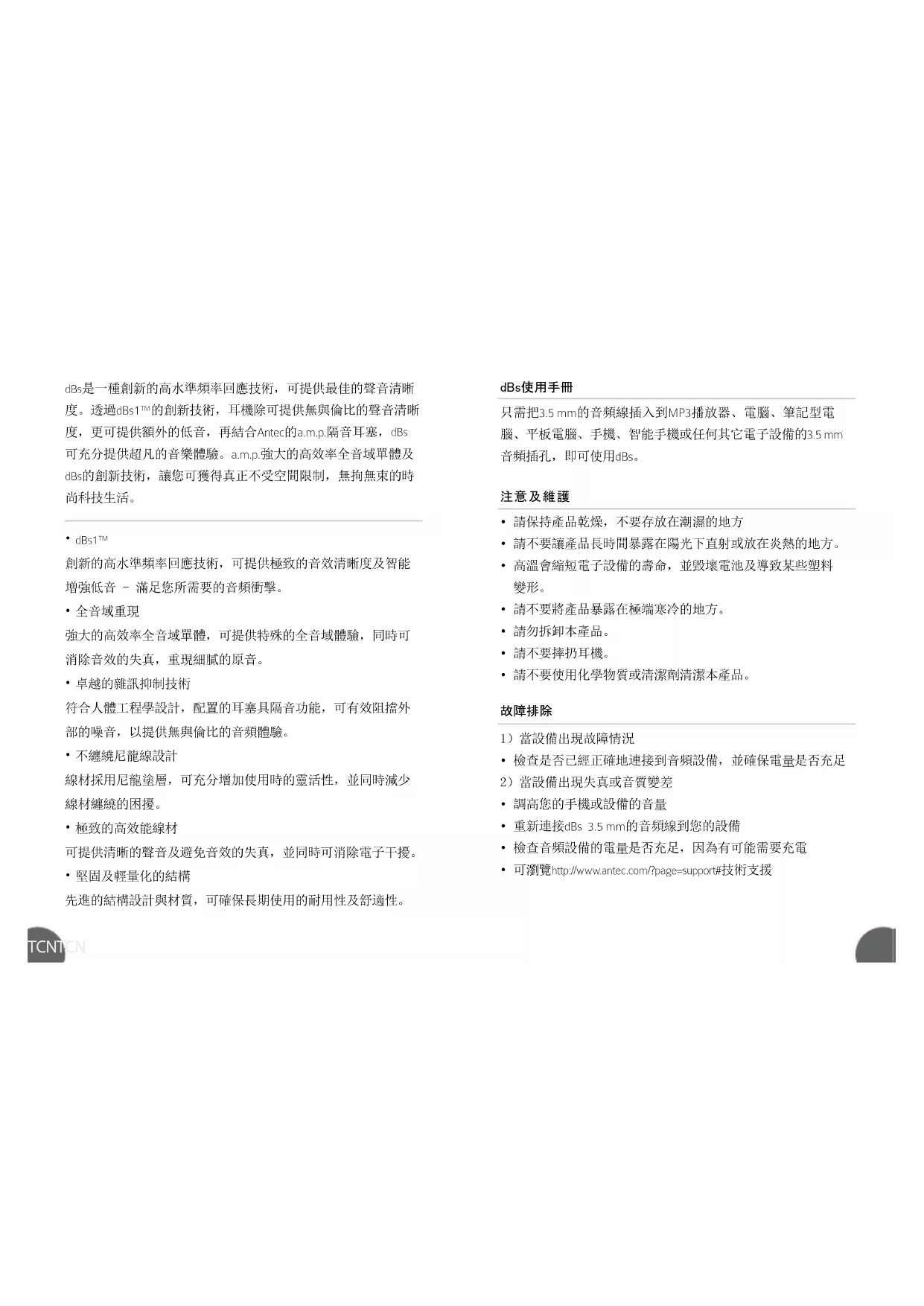 - 製品を化学薬品や洗剤で洗浄しないでください。 ケアとメンテナンスTCN TCN dBs是一種創新的高水準頻率回應技術,可提供最佳的聲音清晰 度。透過dBs1™的創新技術,耳機除可提供無與倫比的聲音清晰 度,更可提供額外的低音,再結合Antec的a.m.p.隔音耳塞, dBs 可充分提供超凡的音樂體驗。a.m.p.強大的高效率全音域單體及 dBs的創新技術,讓您可獲得真正不受空間限制,無拘無束的時