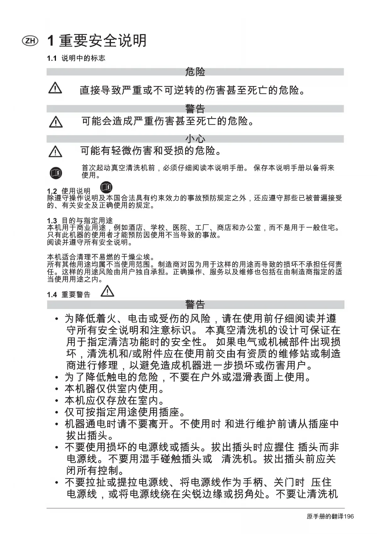 - 为降低着火、电击或受伤的风险,请在使用前仔细阅读并遵 守所有安全说明和注意标识。 本真空清洗机的设计可保证在 用于指定清洁功能时的安全性。 如果电气或机械部件出现损 坏,清洗机和/或附件应在使用前交由有资质的维修站或制造 商进行修理,以避免造成机器进一步损坏或伤害用户。
