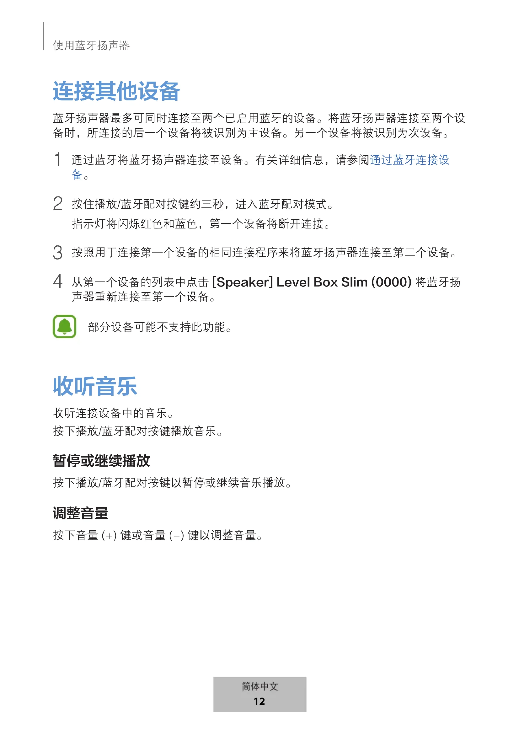 从第一个设备的列表中点击·[Speaker] Level Box Slim (0000)·将蓝牙扬 声器重新连接至第一个设备。 部分设备可能不支持此功能。