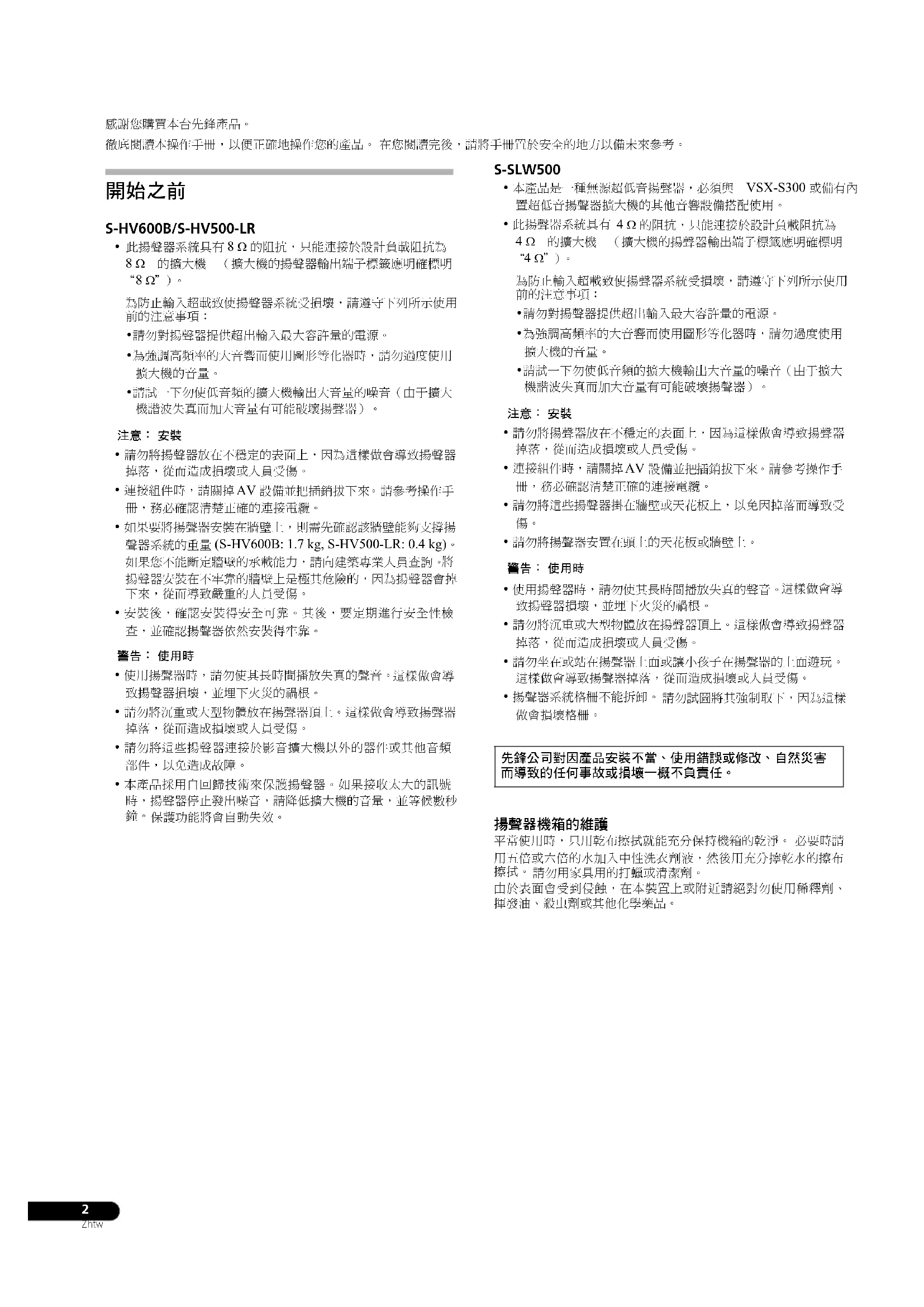 請勿用家具用的打蠟或清潔劑。 由於表面會受到侵蝕,在本裝置上或附近請絕對勿使用稀釋劑、 揮發油、殺虫劑或其他化學藥品。 先鋒公司對因產品安裝不當、使用錯誤或修改、自然災害 而導致的任何事故或損壞一概不負責任。 S-HV600B_S-HV500-LR_En.fm 2 ページ 2011年4月13日 水曜日 午前9時47分3 Zhtw
