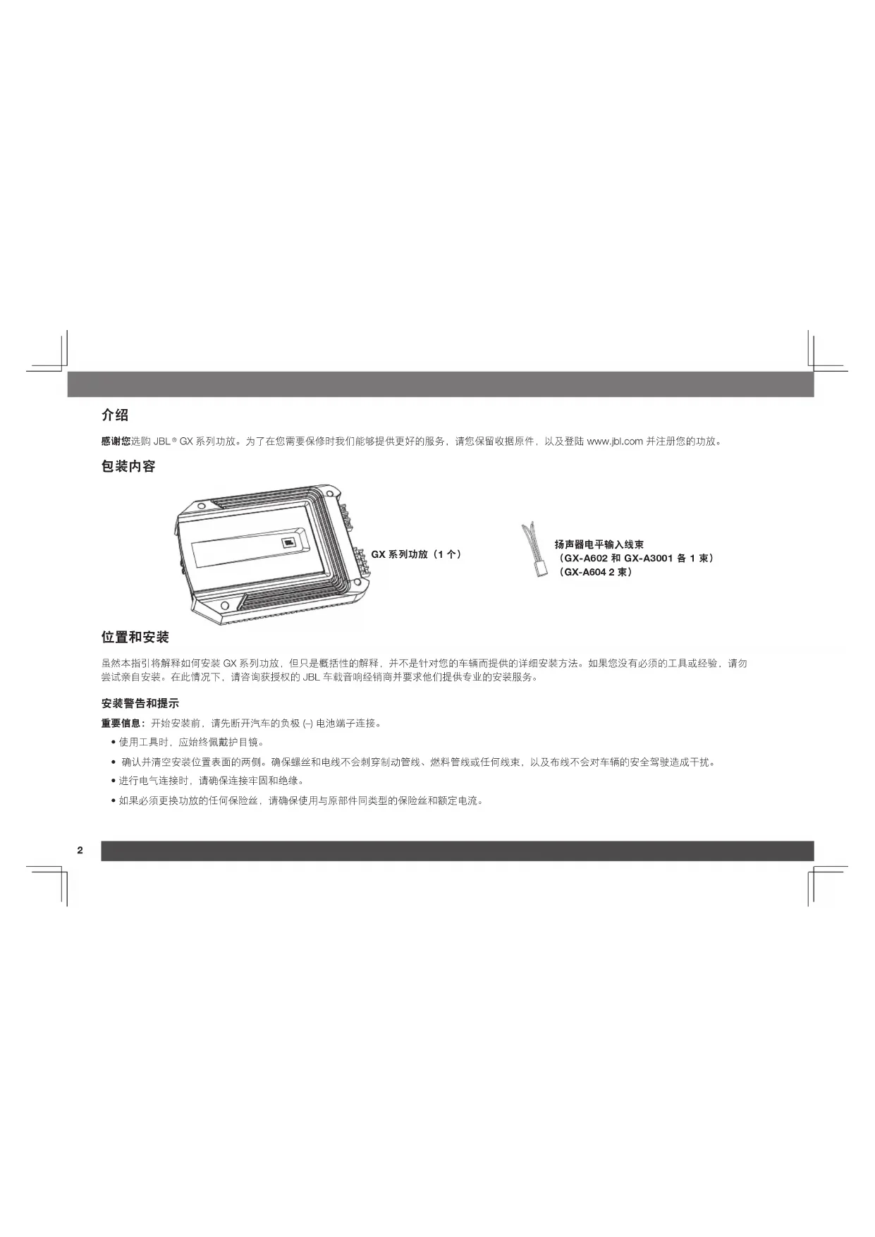 虽然本指引将解释如何安装 GX 系列功放,但只是概括性的解释,并不是针对您的车辆而提供的详细安装方法。如果您没有必须的工具或经验,请勿 尝试亲自安装。在此情况下,请咨询获授权的 JBL 车载音响经销商并要求他们提供专业的安装服务。