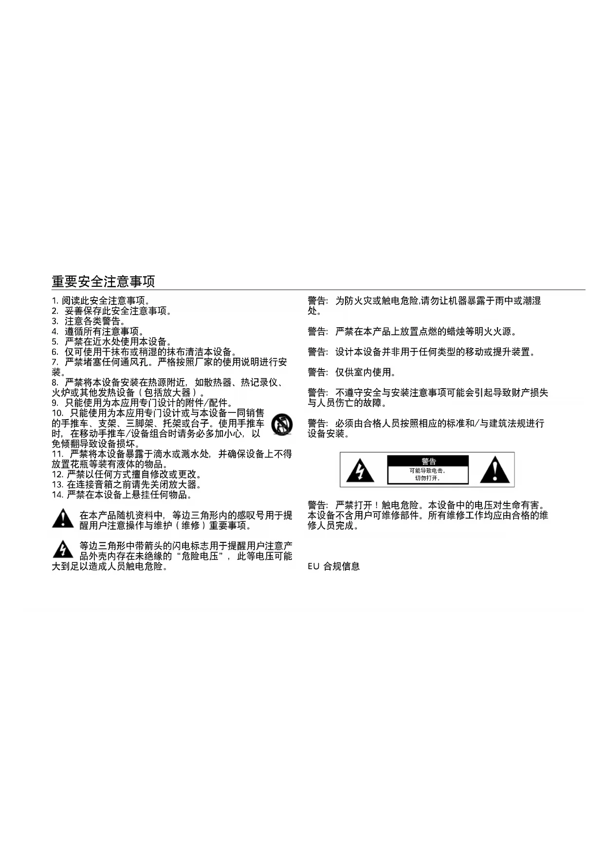 警告:严禁打开!触电危险。本设备中的电压对生命有害。 本设备不含用户可维修部件。所有维修工作均应由合格的维