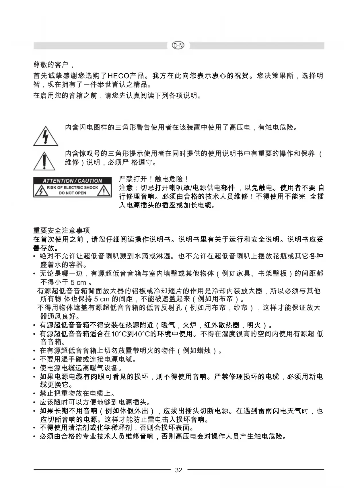 首先诚挚感谢您选购了HECO产品。我方在此向您表示衷心的祝贺。您决策果断,选择明 智,现在拥有了一件举世皆认之精品。 在启用您的音箱之前,请您先认真阅读下列各项说明。 内含闪电图样的三角形警告使用者在该装置中使用了高压电,有触电危险。 内含惊叹号的三角形提示使用者在同时提供的使用说明书中有重要的操作和保养 ( 维修)说明,必须严 格遵守。
