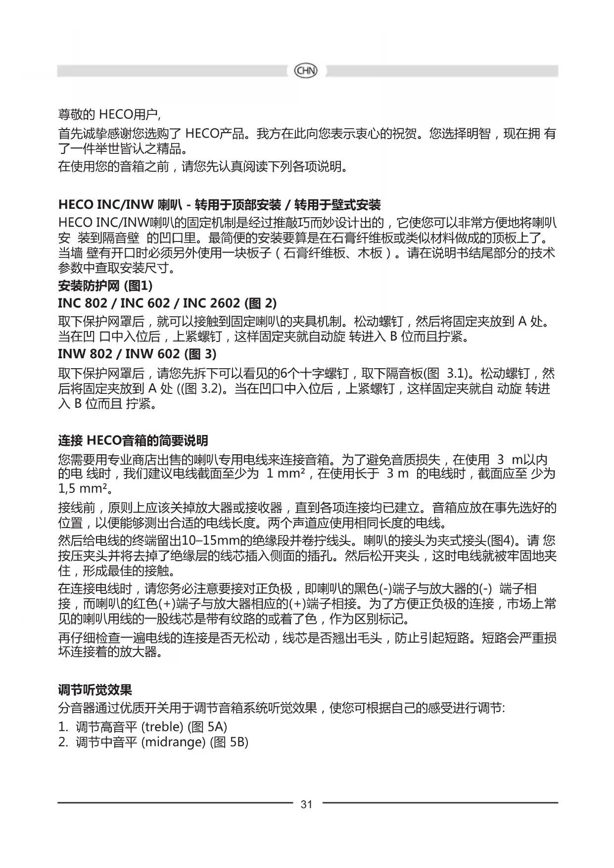 安装防护网 (图1) INC 802 / INC 602 / INC 2602 (图 2) 取下保护网罩后,就可以接触到固定喇叭的夹具机制。松动螺钉,然后将固定夹放到 A 处。 当在凹 口中入位后,上紧螺钉,这样固定夹就自动旋 转进入 B 位而且拧紧。 INW 802 / INW 602 (图 3) 取下保护网罩后,请您先拆下可以看见的6个十字螺钉,取下隔音板(图 3.1)。松动螺钉,然 后将固定夹放到 A 处 ((图 3.2)。当在凹口中入位后,上紧螺钉,这样固定夹就自 动旋 转进 入 B 位而且 拧紧。 连接 HECO音箱的简要说明 您需要用专业商店出售的喇叭专用电线来连接音箱。为了避免音质损失,在使用 3 m以内 的电 线时,我们建议电线截面至少为 1 mm²,在使用长于 3 m 的电线时,截面应至 少为 1,5 mm²。 接线前,原则上应该关掉放大器或接收器,直到各项连接均已建立。音箱应放在事先选好的 位置,以便能够测出合适的电线长度。两个声道应使用相同长度的电线。 然后给电线的终端留出10–15mm的绝缘段并卷拧线头。喇叭的接头为夹式接头(图4)。请 您 按压夹头并将去掉了绝缘层的线芯插入侧面的插孔。然后松开夹头,这时电线就被牢固地夹