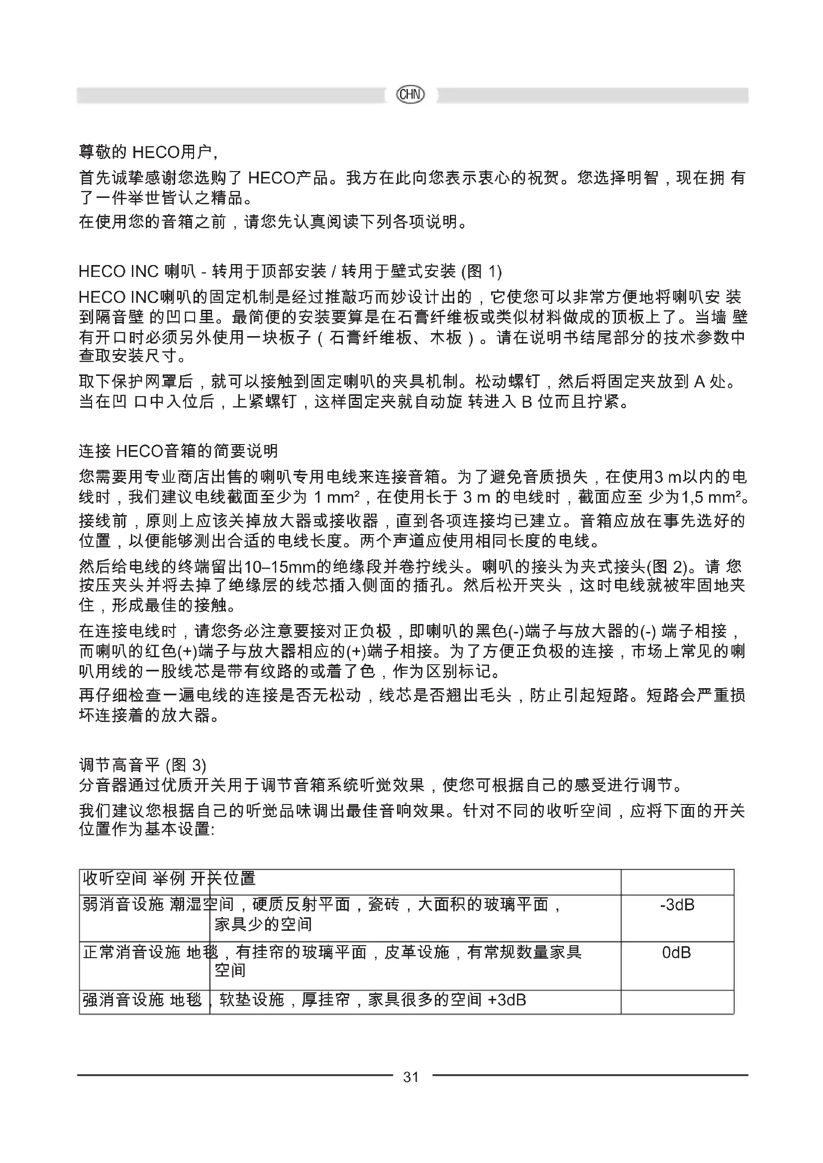 RUS尊敬的 HECO用户, 首先诚挚感谢您选购了 HECO产品。我方在此向您表示衷心的祝贺。您选择明智,现在拥 有 了一件举世皆认之精品。 在使用您的音箱之前,请您先认真阅读下列各项说明。 HECO INC 喇叭 - 转用于顶部安装 / 转用于壁式安装 (图 1) HECO INC喇叭的固定机制是经过推敲巧而妙设计出的,它使您可以非常方便地将喇叭安 装 到隔音壁 的凹口里。最简便的安装要算是在石膏纤维板或类似材料做成的顶板上了。当墙 壁 有开口时必须另外使用一块板子(石膏纤维板、木板)。请在说明书结尾部分的技术参数中
