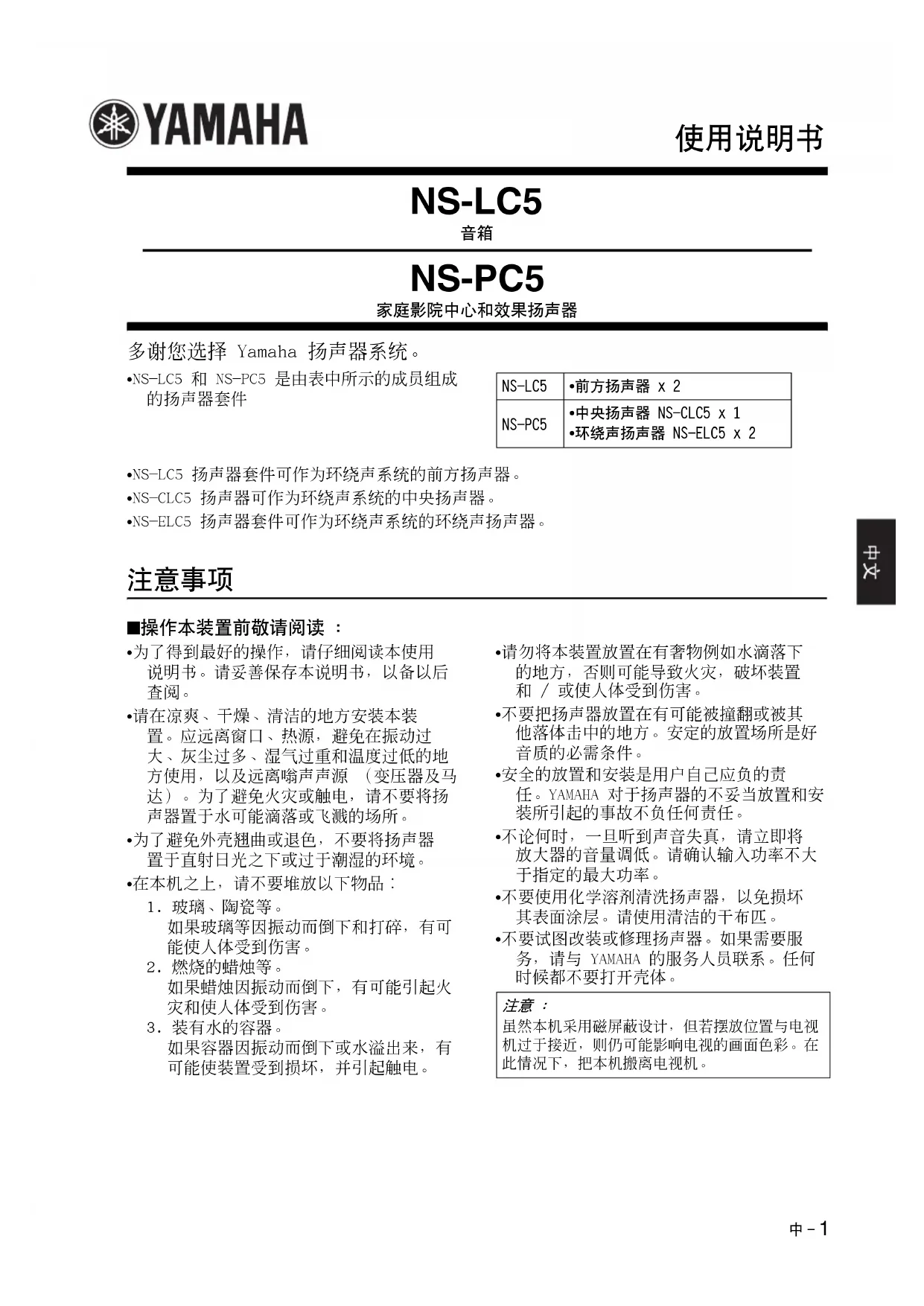 - 请在凉爽、干燥、清洁的地方安装本装置。应远离窗口、热源,避免在振动过大、灰尘过多、湿气过重和温度过低的地方使用,以及远离嗡声声源 (变压器及马达)。为了避免火灾或触电,请不要将扬声器置于水可能滴落或飞溅的场所。• 为了避免外壳翘曲或退色,不要将扬声器置于直射日光之下或过于潮湿的环境。• 在本机之上,请不要堆放以下物品∶1. 玻璃、陶瓷等。如果玻璃等因振动而倒下和打碎,有可能使人体受到伤害。2. 燃烧的蜡烛等。如果蜡烛因振动而倒下,有可能引起火灾和使人体受到伤害。3. 装有水的容器。如果容器因振动而倒下或水溢出来,有可能使装置受到损坏,并引起触电。• 请勿将本装置放置在有奢物例如水滴落下的地方,否则可能导致火灾,破坏装置和 / 或使人体受到伤害。• 不要把扬声器放置在有可能被撞翻或被其他落体击中的地方。安定的放置场所是好音质的必需条件。• 安全的放置和安装是用户自己应负的责任。YAMAHA 对于扬声器的不妥当放置和安装所引起的事故不负任何责任。• 不论何时,一旦听到声音失真,请立即将放大器的音量调低。请确认输入功率不大于指定的最大功率。• 不要使用化学溶剂清洗扬声器,以免损坏其表面涂层。请使用清洁的干布匹。• 不要试图改装或修理扬声器。如果需要服务,请与 YAMAHA 的服务人员联系。任何时候都不要打开壳体。NS-LC5• 前方扬声器 x 2NS-PC5• 中央扬声器 NS-CLC5 x 1• 环绕声扬声器 NS-ELC5 x 2注意 : 虽然本机采用磁屏蔽设计,但若摆放位置与电视机过于接近,则仍可能影响电视的画面色彩。在此情况下,把本机搬离电视机。
