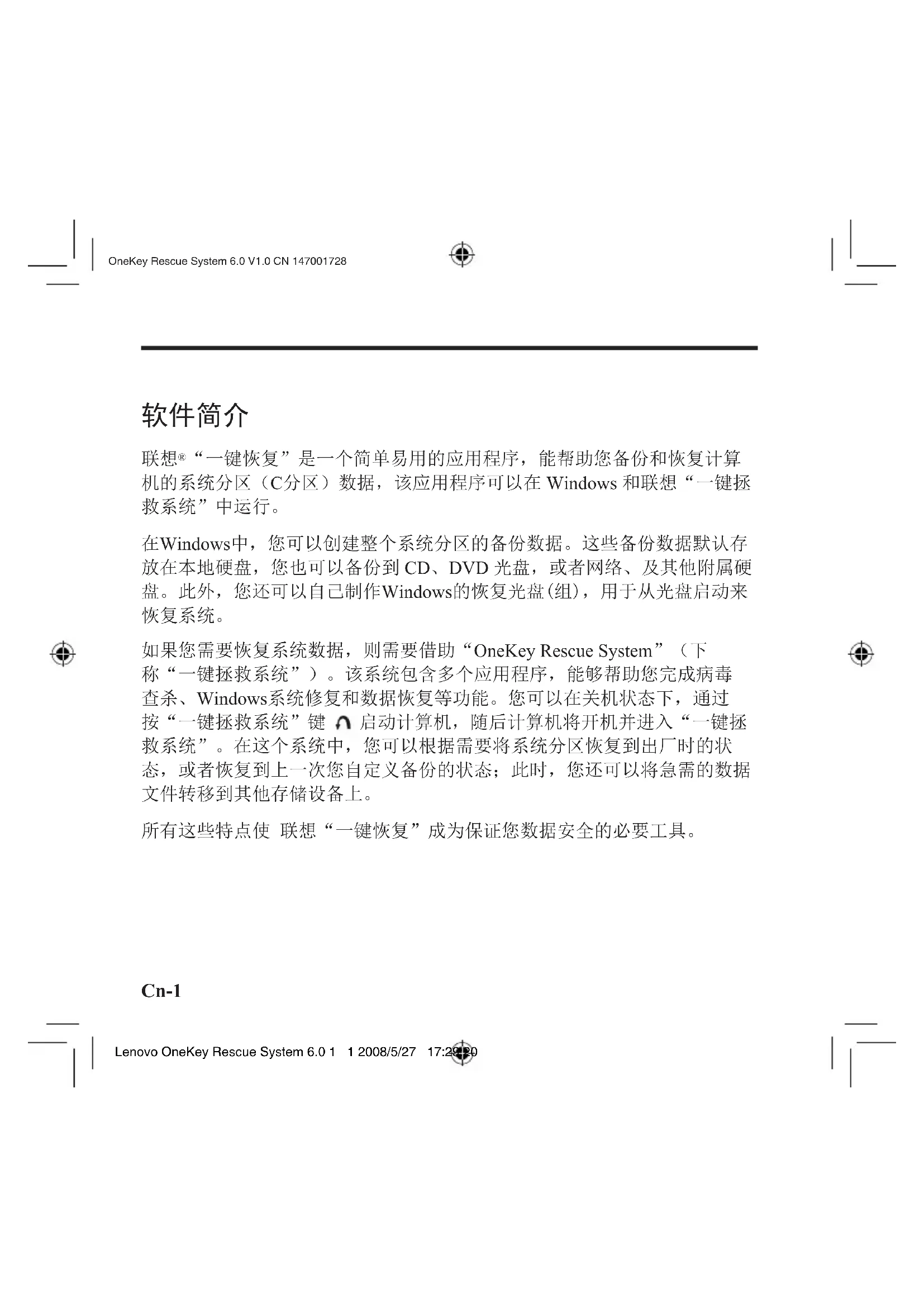 如果您需要恢复系统数据,则需要借助“OneKey Rescue System”(下 称“一键拯救系统”)。该系统包含多个应用程序,能够帮助您完成病毒 查杀、Windows系统修复和数据恢复等功能。您可以在关机状态下,通过 按“一键拯救系统”键. .启动计算机,随后计算机将开机并进入“一键拯 救系统”。在这个系统中,您可以根据需要将系统分区恢复到出厂时的状 态,或者恢复到上一次您自定义备份的状态;此时,您还可以将急需的数据 文件转移到其他存储设备上。 所有这些特点使.联想“一键恢复”成为保证您数据安全的必要工具。 Lenovo OneKey Rescue System 6.0 1 1 2008/5/27 17:29:20Cn-2