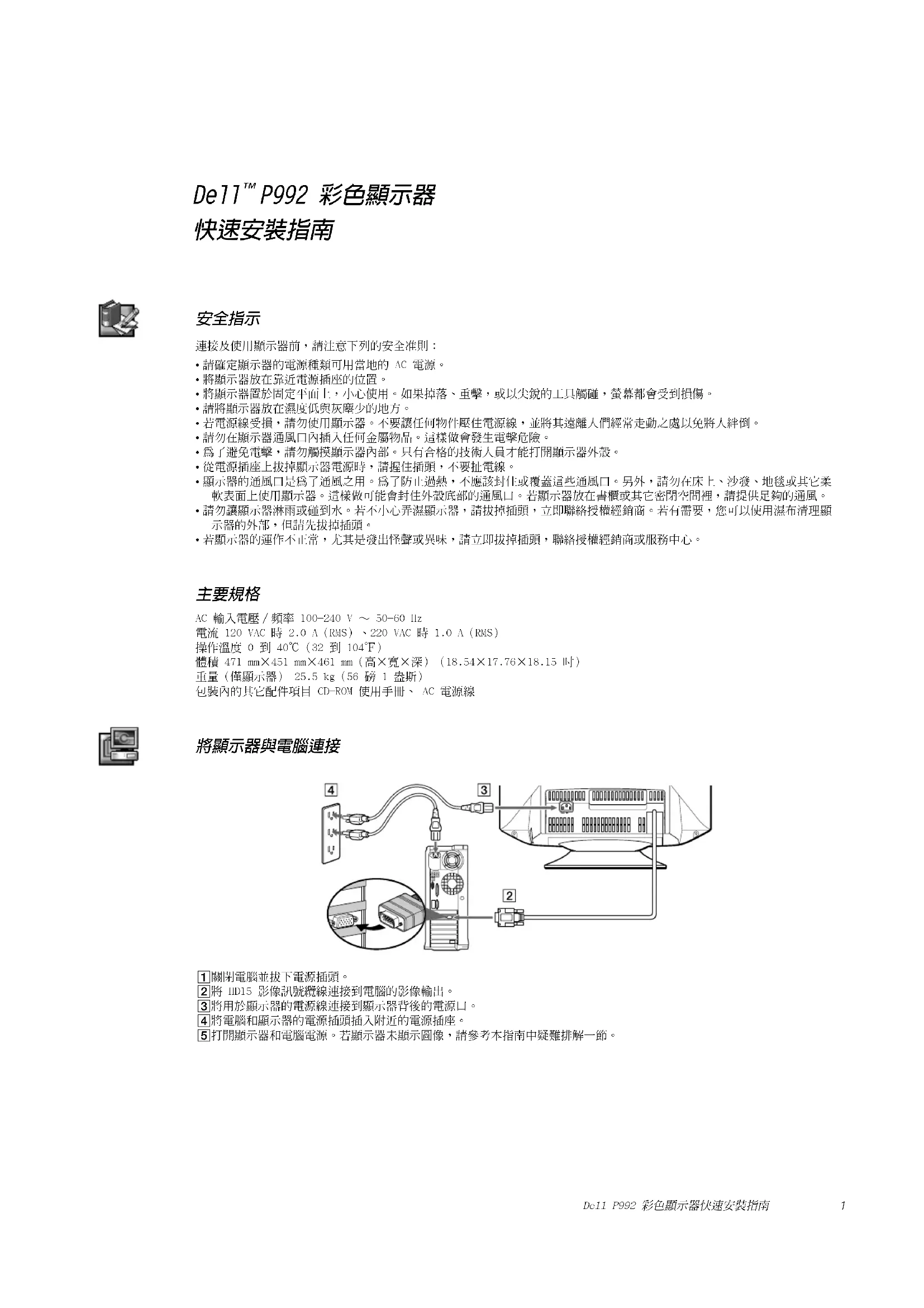連接及使用顯示器前,請注意下列的安全准則:• 請確定顯示器的電源種類可用當地的 AC 電源。• 將顯示器放在靠近電源插座的位置。• 將顯示器置於固定平面上,小心使用。如果掉落、重擊,或以尖銳的工具觸碰,螢幕都會受到損傷。• 請將顯示器放在濕度低與灰塵少的地方。• 若電源線受損,請勿使用顯示器。不要讓任何物件壓住電源線,並將其遠離人們經常走動之處以免將人絆倒。• 請勿在顯示器通風口內插入任何金屬物品。這樣做會發生電擊危險。• 為了避免電擊,請勿觸摸顯示器內部。只有合格的技術人員才能打開顯示器外殼。• 從電源插座上拔掉顯示器電源時,請握住插頭,不要扯電線。• 顯示器的通風口是為了通風之用。為了防止過熱,不應該封住或覆蓋這些通風口。另外,請勿在床上、沙發、地毯或其它柔軟表面上使用顯示器。這樣做可能會封住外殼底部的通風口。若顯示器放在書櫃或其它密閉空間裡,請提供足夠的通風。• 請勿讓顯示器淋雨或碰到水。若不小心弄濕顯示器,請拔掉插頭,立即聯絡授權經銷商。若有需要,您可以使用濕布清理顯示器的外部,但請先拔掉插頭。• 若顯示器的運作不正常,尤其是發出怪聲或異味,請立即拔掉插頭,聯絡授權經銷商或服務中心。 AC 輸入電壓∕頻率 100-240 V ∼ 50-60 Hz電流 120 VAC 時 2.0 A(RMS)、220 VAC 時 1.0 A(RMS)操作溫度 0 到 40℃(32 到 104℉)體積 471 mm×451 mm×461 mm(高×寬×深)(18.54×17.76×18.15 吋)重量(僅顯示器) 25.5 kg(56 磅 1 盎斯)包裝內的其它配件項目 CD-ROM 使用手冊、 AC 電源線 1 關閉電腦並拔下電源插頭。2 將 HD15 影像訊號纜線連接到電腦的影像輸出。3 將用於顯示器的電源線連接到顯示器背後的電源口。4 將電腦和顯示器的電源插頭插入附近的電源插座。5 打開顯示器和電腦電源。若顯示器未顯示圖像,請參考本指南中疑難排解一節。 Dell