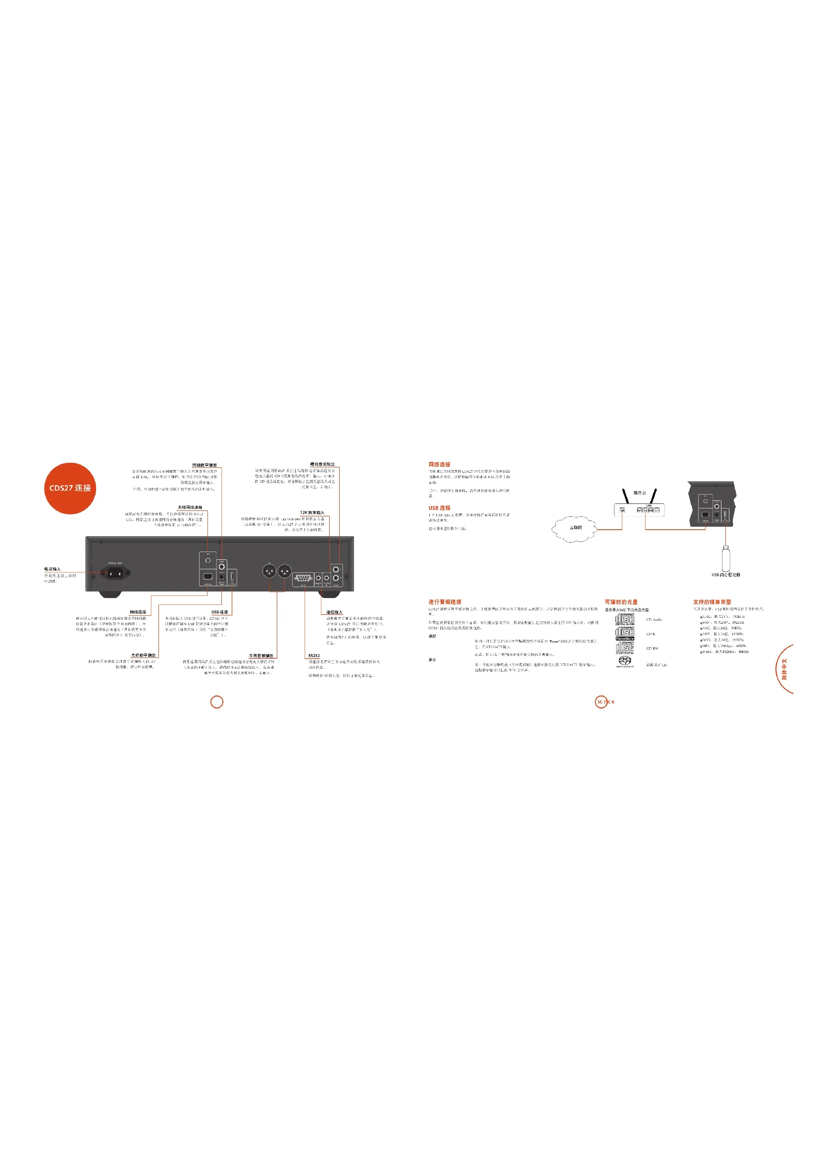 请参阅第5页的内容,以便了解更多信息。 USB 连接 在此处插入 USB 闪存设备。CDS27 也可 以播放存储在 USB 存储设备上的特定数 字文件(请参阅第 7 页的“支持的媒体