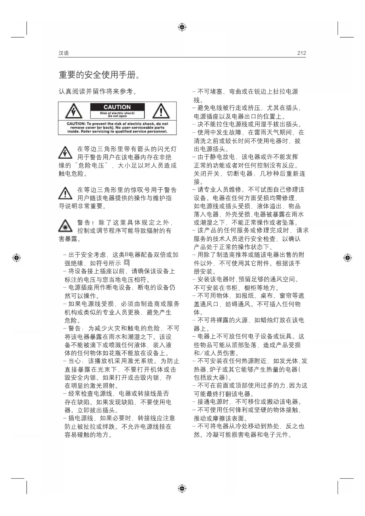 – 警告: 为减少火灾和触电的危险,不可 将该电器暴露在雨水和潮湿之下。该设 备不能被滴下或喷溅任何液体,装入液 体的任何物体如花瓶不能放在设备上。 – 当心: 该播放机采用激光系统。为防止 直接暴露在光束下, 不要打开机体或击 毁安全内锁。如果打开或击毁内锁,存