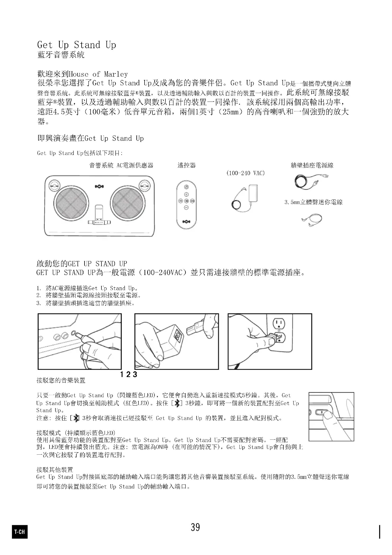 欢迎来到House of Marley 很荣幸您选择了Get Up Stand Up及成为您的音乐伴侣。 Get Up Stand Up是一个携带式双向立体声音响系统。此系 统可无线接驳蓝芽®装置,以及透过辅助输入与数以百计的装置一同操作此系统可无线接驳蓝芽®装置,以及透过辅助 输入与数以百计的装置一同操作。该系统采用两个高输出功率,远距4.5英寸(100毫米)低音单元音箱,两个1英寸 (25mm)的高音喇叭和一个强劲的放大器。 即兴演奏尽在Get Up Stand Up Get Up Stand Up包含以下项目: