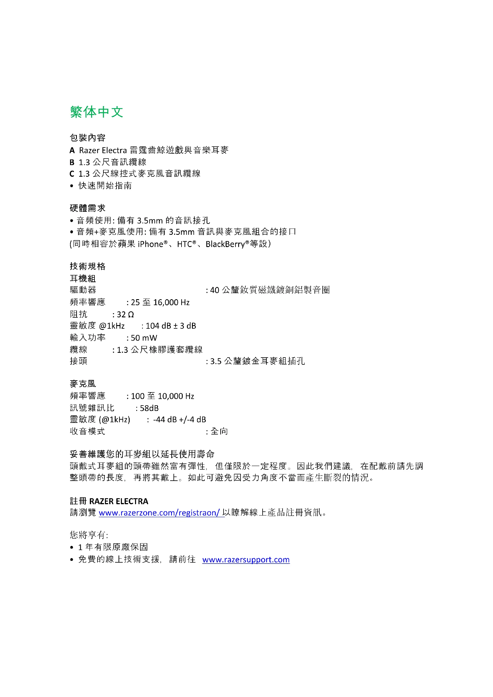 妥善維護您的耳麥組以延長使用壽命 頭戴式耳麥組的頭帶雖然富有彈性,但僅限於一定程度。因此我們建議,在配戴前請先調 整頭帶的長度,再將其戴上。如此可避免因受力角度不當而產生斷裂的情況。 註冊 RAZER ELECTRA 請瀏覽 www.razerzone.com/registration/ 以瞭解線上產品註冊資訊。