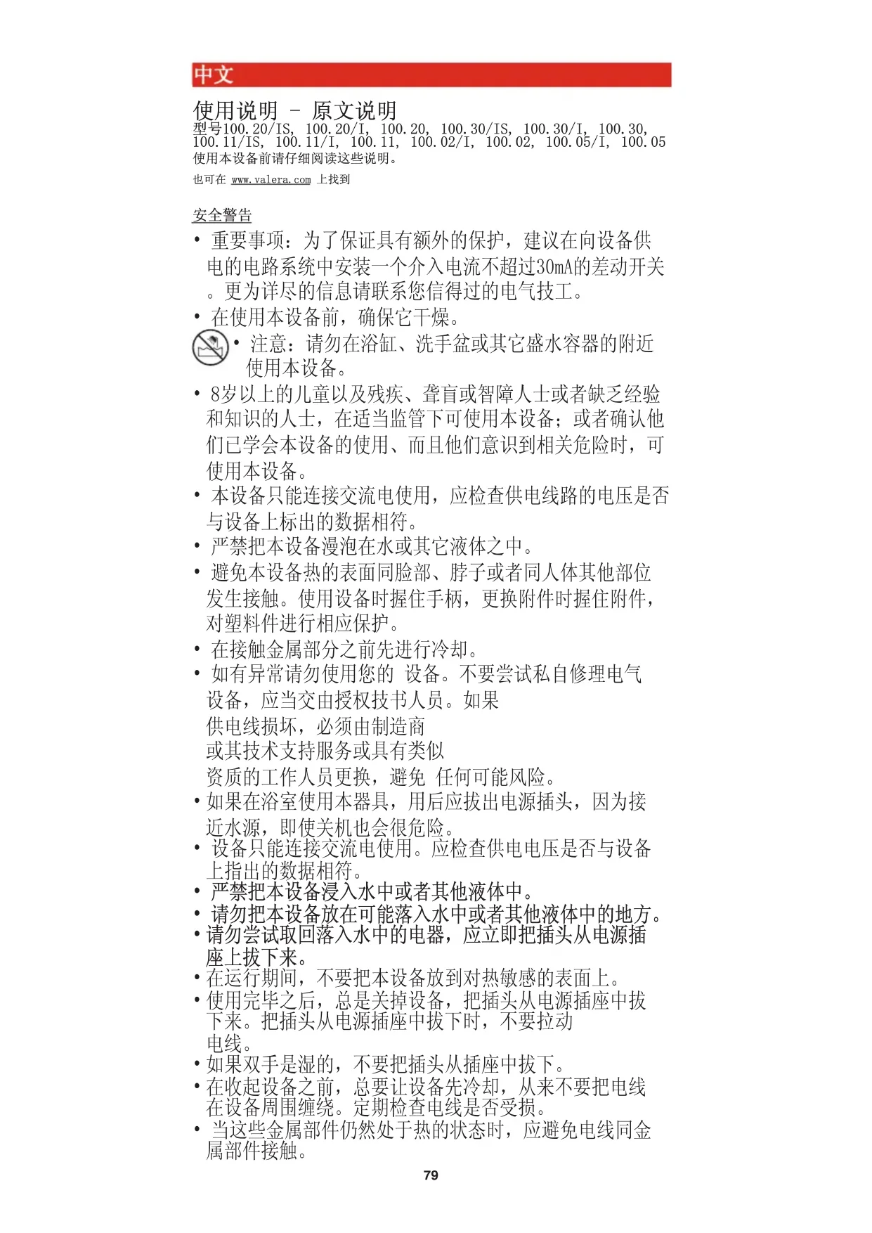 ION (离子)功能 (仅型号100.20/IS, 100.20/I, 100.30/IS, 100.30/I, 100.11/IS, 100.11/I, 100.02/I, 100.05/I) 这个产品在使用期间总是保持启动“ION (离子)”功能。 本电器可产生负离子流。 离子发生器可能会发出轻微的嗡嗡声,应被视为正