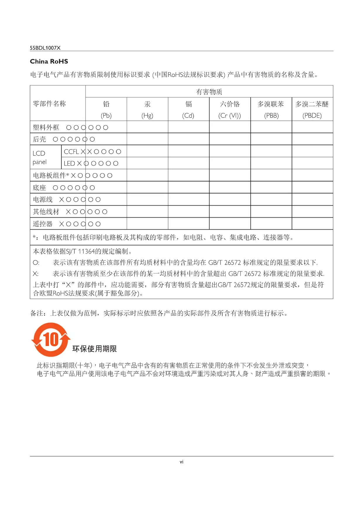 此標識指期限(十年),電子电气產品中含有的有害物質在正常使用的條件下不會發生外泄或突變, 電子电气產品用戶使用該電子电气產品不會對環境造成嚴重污染或對其人身、財產造成嚴重損害的期限。55BDL1007X vii 《废弃电器电子产品回收处理管理条例》提示性说明 为了更好地关爱及保护地球,当用户不再需要此产品或产品寿命终止时,请遵守国家废弃电器电子产品 回收处理相关法律法规,将其交给当地具有国家认可的回收处理资质的厂商进行回收处理。