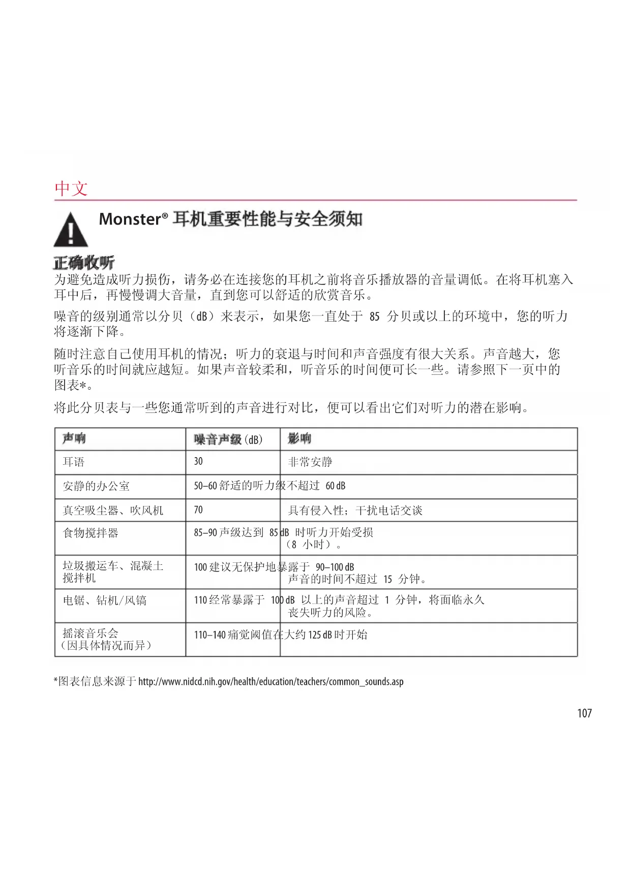 为避免造成听力损伤,请务必在连接您的耳机之前将音乐播放器的音量调低。在将耳机塞入 耳中后,再慢慢调大音量,直到您可以舒适的欣赏音乐。 噪音的级别通常以分贝(dB)来表示,如果您一直处于 85 分贝或以上的环境中,您的听力