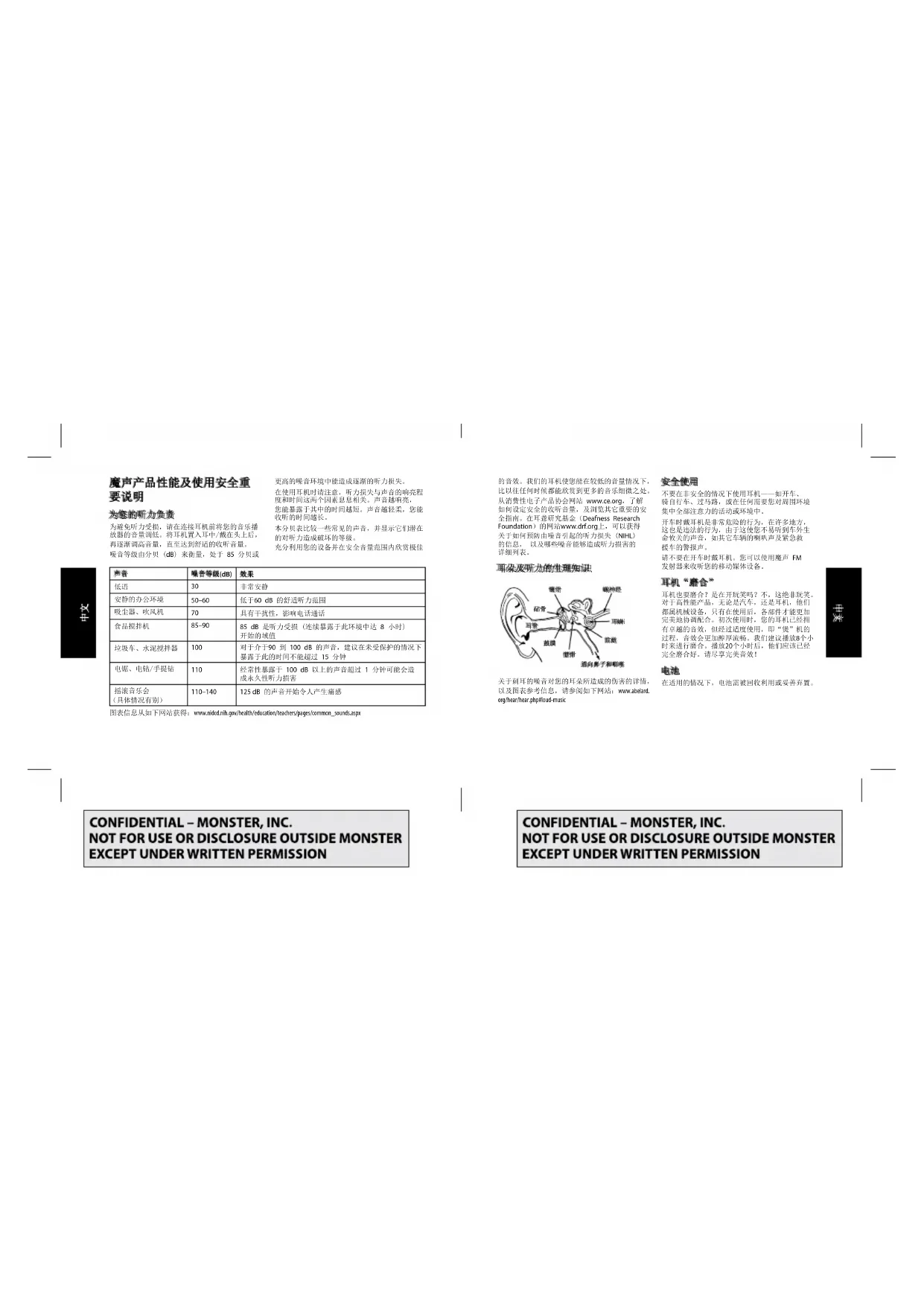 110–140 125 dB 的声音开始令人产生痛感 图表信息从如下网站获得:www.nidcd.nih.gov/health/education/teachers/pages/common_sounds.aspx 的音效。我们的耳机使您能在较低的音量情况下, 比以往任何时候都能欣赏到更多的音乐细微之处。 从消费性电子产品协会网站 www.ce.org,了解 如何设定安全的收听音量,及浏览其它重要的安 全指南。在耳聋研究基金(Deafness Research Foundation)的网站www.drf.org上,可以获得 关于如何预防由噪音引起的听力损失 (NIHL) 的信息, 以及哪些噪音能够造成听力损害的