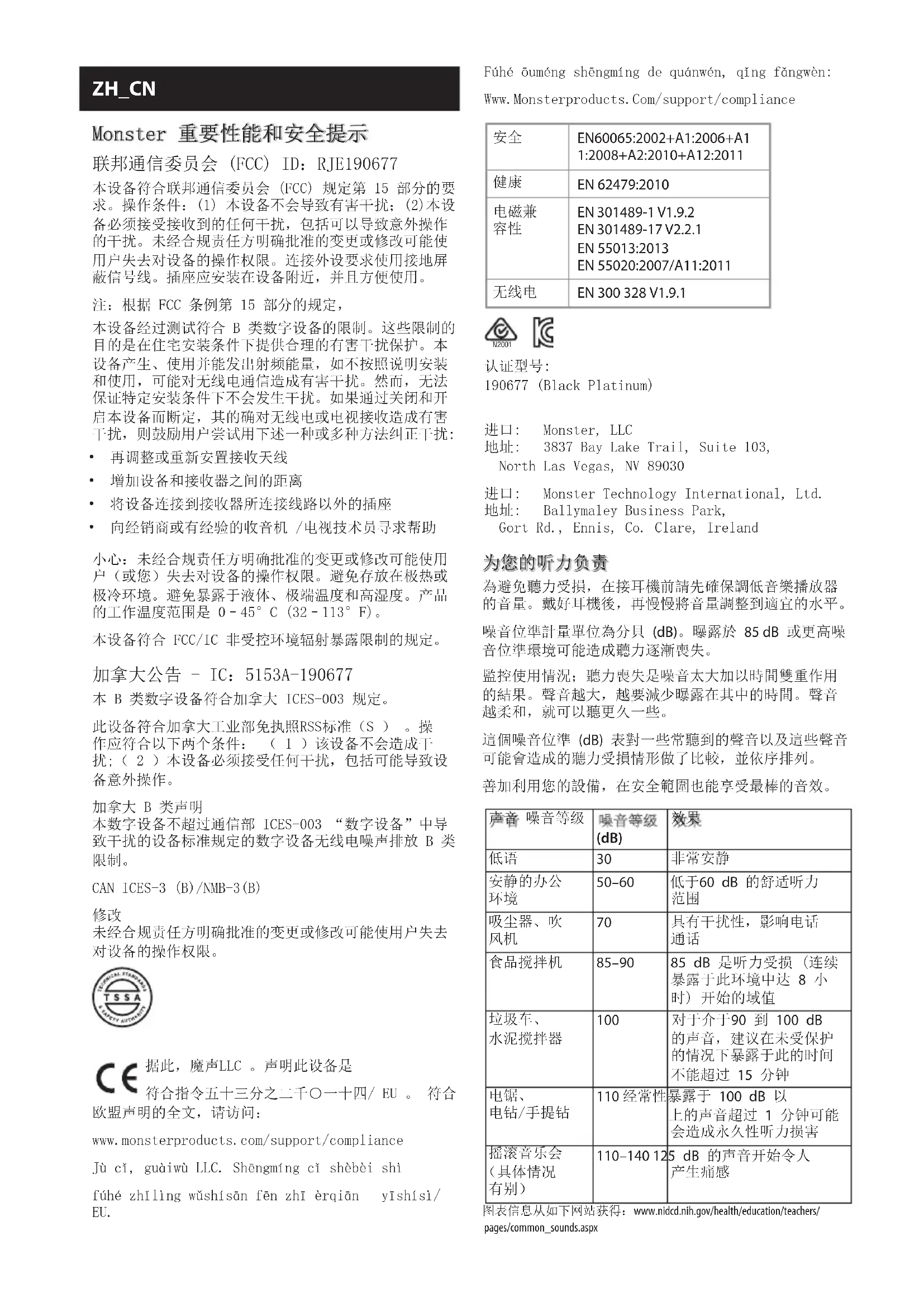 有雷电或长时间不用时,请拔除本装置的电源。请勿安装在任何热源附近, 例如暖气片、集热器、火炉或会发热的其他装置(包括扩音器) 请仅使用制造商指定的附件。所有维修仅可由符合资格的维修人员进行。 装置发生任何损坏后应进行维修,例如被液体洒溅或有物体落入、装置被 雨水或潮气浸湿、无法正常运行或发生跌落。 版本 121912– 全球 ©2003–2016 Monster, LLCKO 중요 Monster® 성능 및 안전 정보