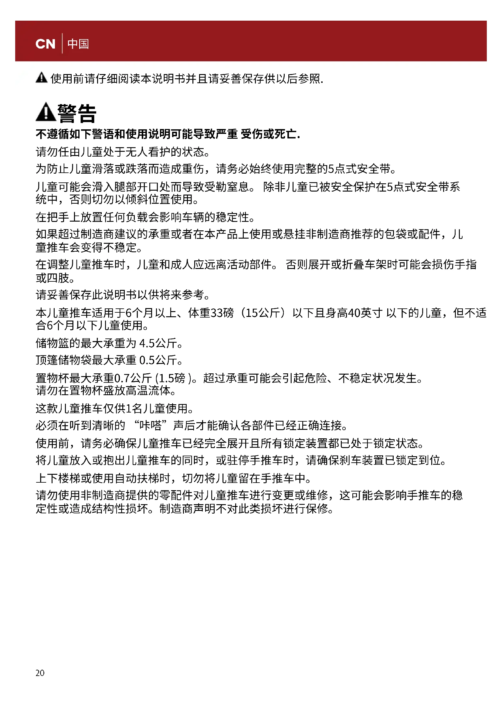 请妥善保存此说明书以供将来参考。 本儿童推车适用于6个月以上、体重33磅(15公斤)以下且身高40英寸 以下的儿童,但不适 合6个月以下儿童使用。 储物篮的最大承重为 4.5公斤。 顶篷储物袋最大承重 0.5公斤。 置物杯最大承重0.7公斤 (1.5磅 )。超过承重可能会引起危险、不稳定状况发生。 请勿在置物杯盛放高温流体。 这款儿童推车仅供1名儿童使用。 必须在听到清晰的 “咔嗒”声后才能确认各部件已经正确连接。 使用前,请务必确保儿童推车已经完全展开且所有锁定装置都已处于锁定状态。 将儿童放入或抱出儿童推车的同时,或驻停手推车时,请确保刹车装置已锁定到位。 上下楼梯或使用自动扶梯时,切勿将儿童留在手推车中。 请勿使用非制造商提供的零配件对儿童推车进行变更或维修,这可能会影响手推车的稳 定性或造成结构性损坏。制造商声明不对此类损坏进行保修。 使用前请仔细阅读本说明书并且请妥善保存供以后参照.