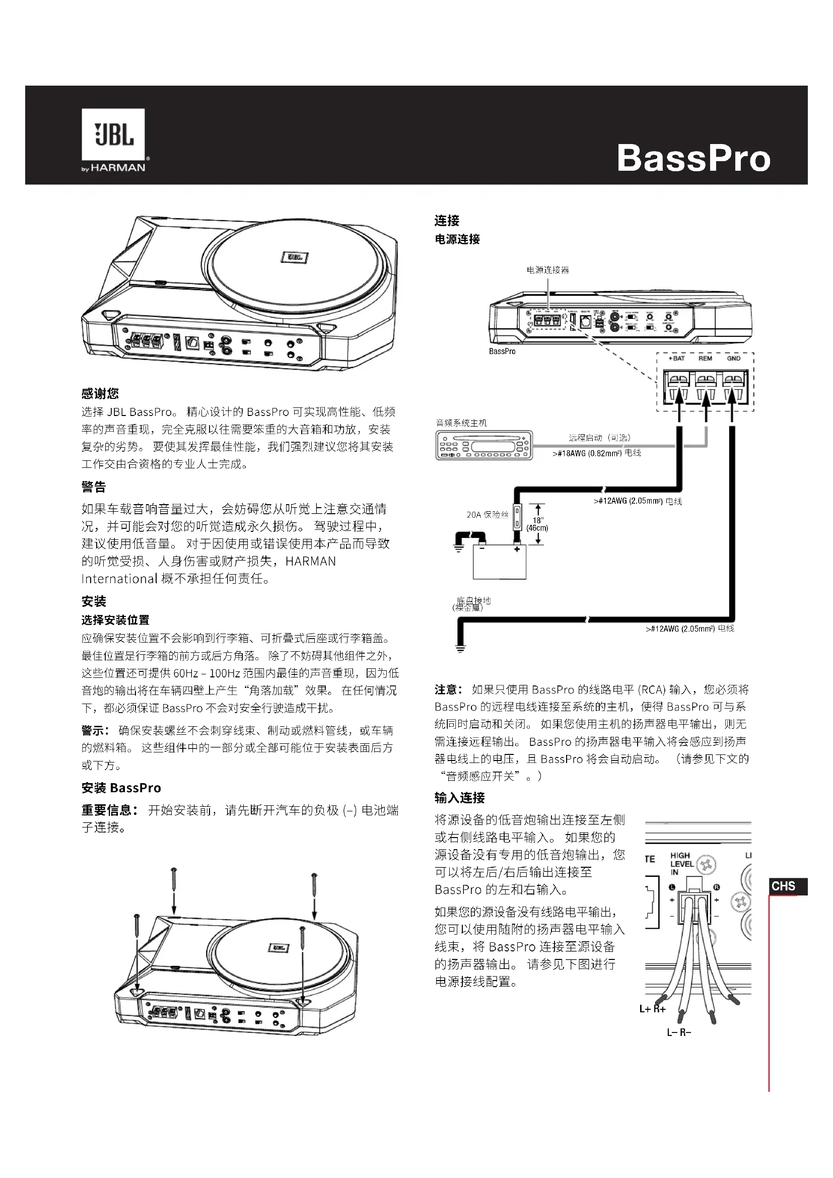 选择 JBL BassPro。 精心设计的 BassPro 可实现高性能、低频 率的声音重现,完全克服以往需要笨重的大音箱和功放,安装 复杂的劣势。 要使其发挥最佳性能,我们强烈建议您将其安装 工作交由合资格的专业人士完成。
