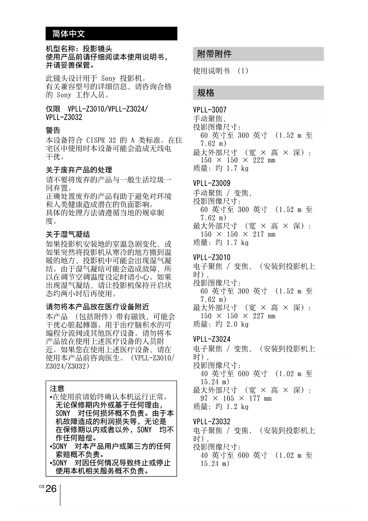 请勿将本产品放在医疗设备附近 本产品 (包括附件)带有磁铁,可能会 干扰心脏起搏器、用于治疗脑积水的可 编程分流阀或其他医疗设备。请勿将本 产品放在使用上述医疗设备的人员附 近。如果您在使用上述医疗设备,请在 使用本产品前咨询医生。(VPLL-Z3010/ Z3024/Z3032) 使用说明书 (1) VPLL-3007