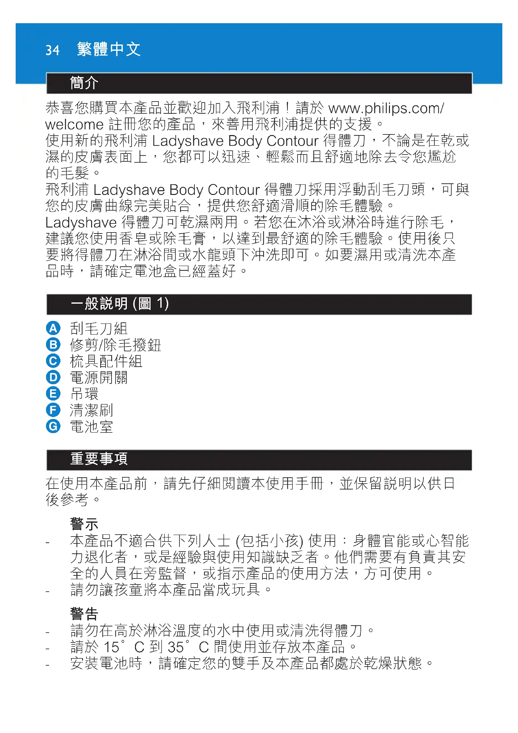 恭喜您購買本產品並歡迎加入飛利浦!請於 www.philips.com/ welcome 註冊您的產品,來善用飛利浦提供的支援。 使用新的飛利浦 Ladyshave Body Contour 得體刀,不論是在乾或 濕的皮膚表面上,您都可以迅速、輕鬆而且舒適地除去令您尷尬