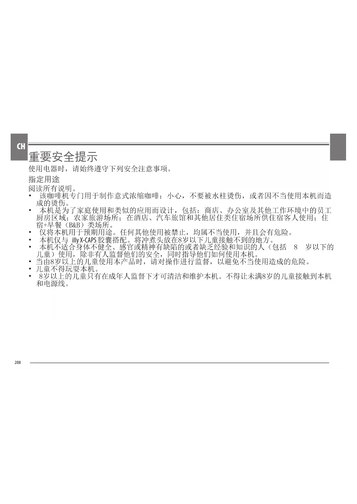 切勿将本机或其可拆卸的组件浸入水中或放入洗碗机。 水箱中的水应定期更换。水箱无水时请不要使用本咖啡机。按照 “除垢” 一章的说明,建议 至少每 2 个月使用一次意式浓缩咖啡机专用除垢产品。 注意:该机器仅与 illy X·CAPS 胶囊搭配。216