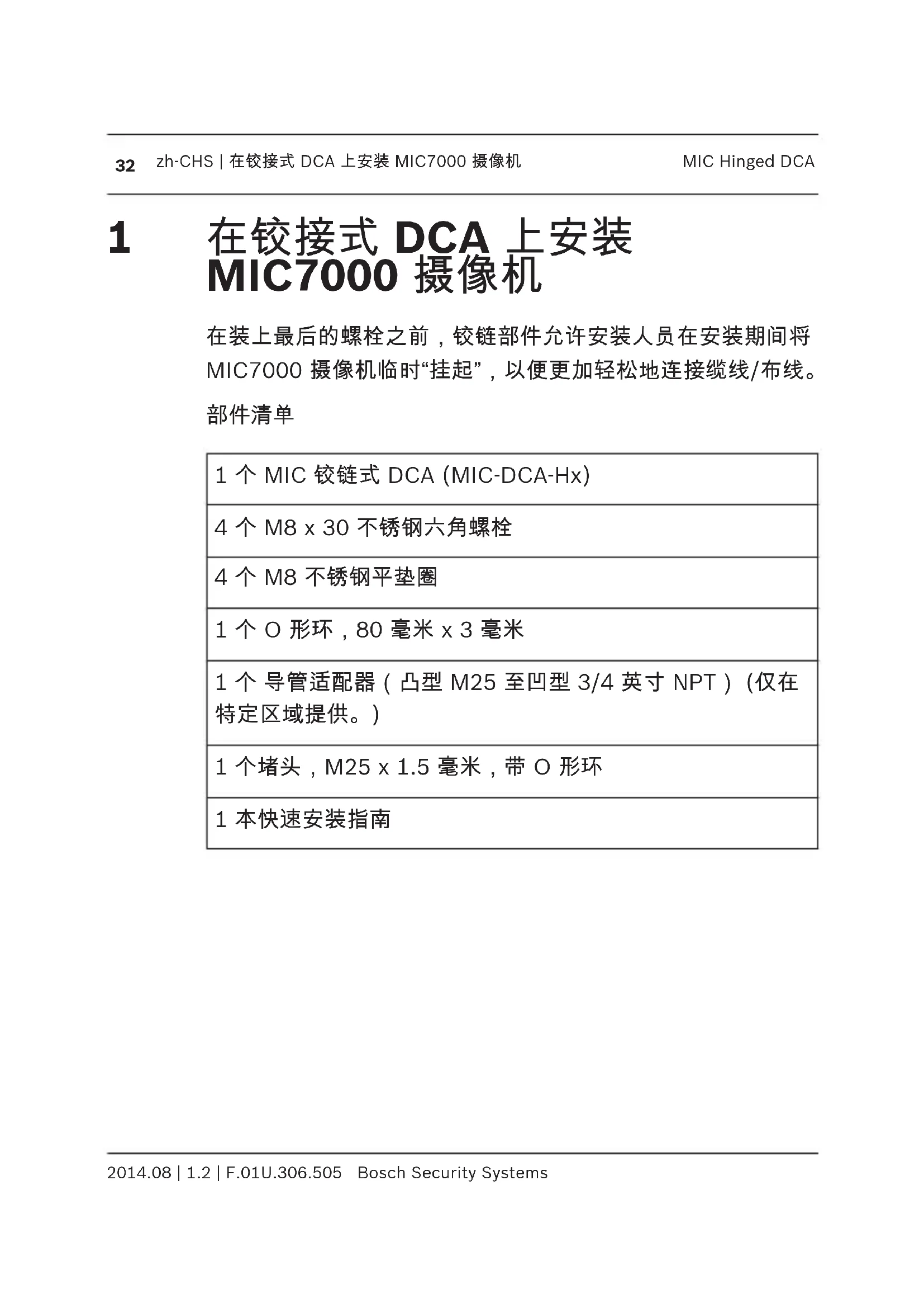 zh-CHS | 在铰接式 DCA 上安装 MIC7000 摄像机 MIC Hinged DCA 2014.08 | 1.2 | F.01U.306.505 Bosch Security Systems所需的其它工具 1 Torx T25 螺丝刀,用于拧松和拧紧钩头螺栓 1 用于固定 M8 螺栓(已提供)以将摄像机安装到 DCA 的扳手/螺丝