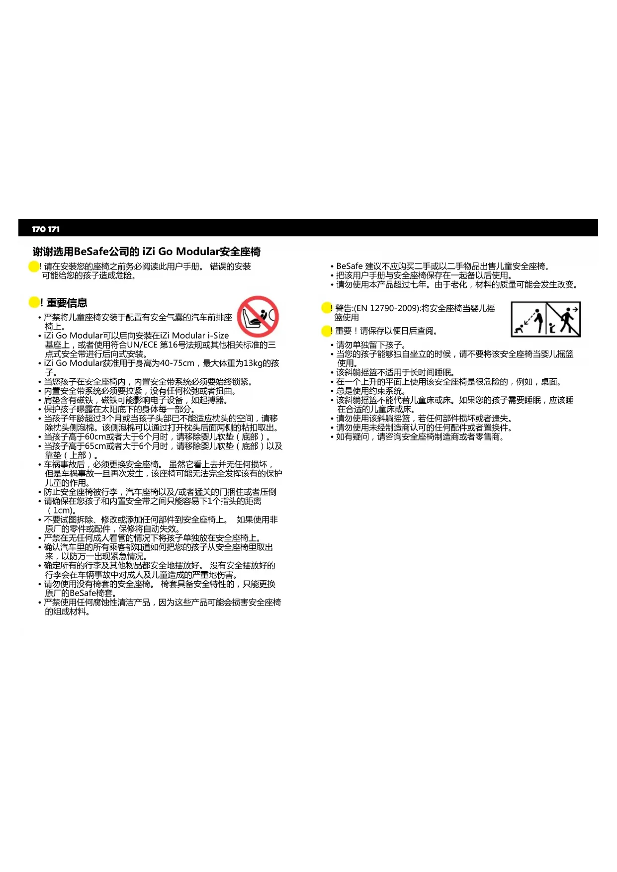 谢谢选用BeSafe公司的 iZi Go Modular安全座椅 ! 请在安装您的座椅之前务必阅读此用户手册。 错误的安装 可能给您的孩子造成危险。