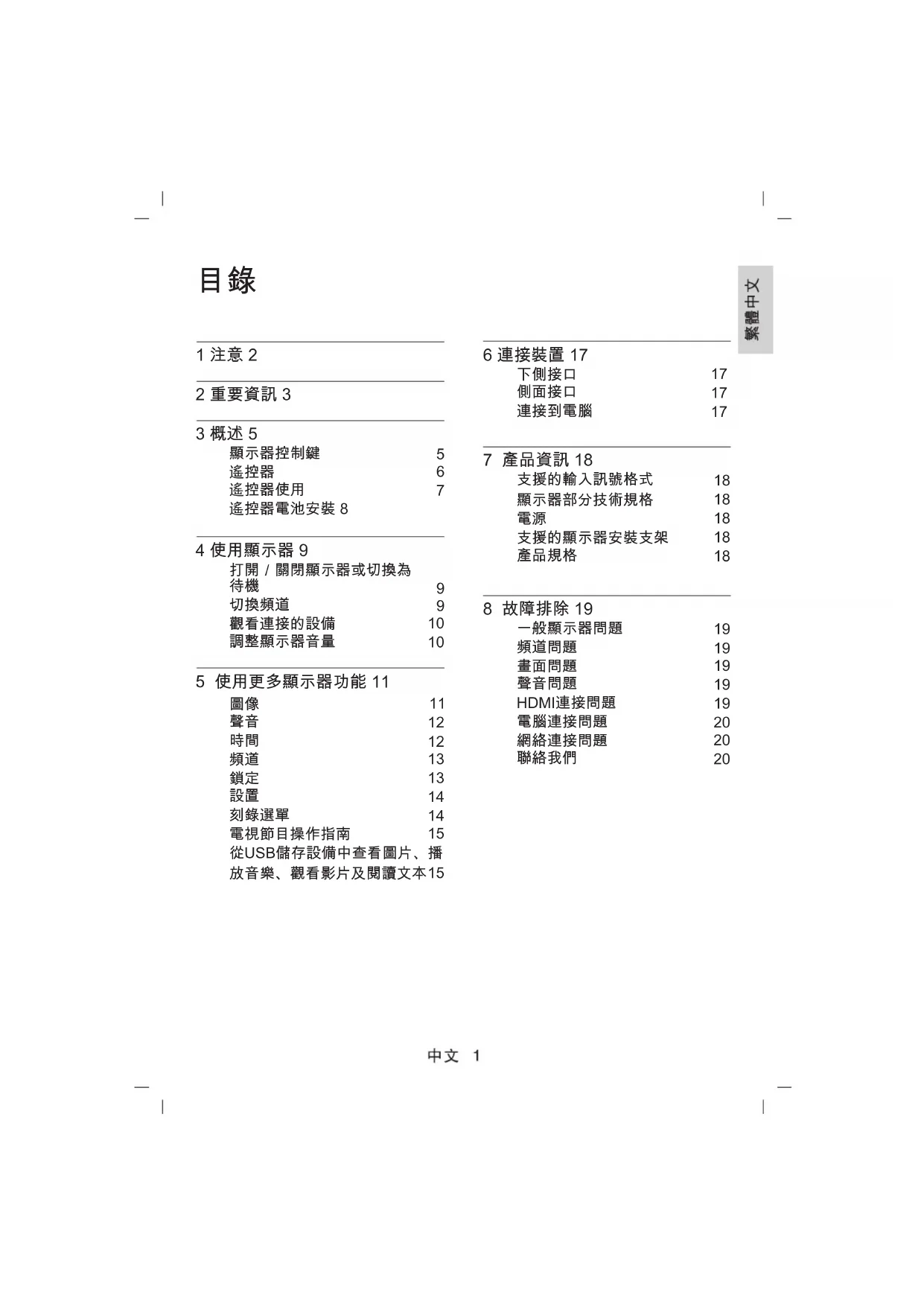 - 重量:3.9 kg 32"中文 1 9 8 故障排除 本節介紹常見問題及其解決辦法。