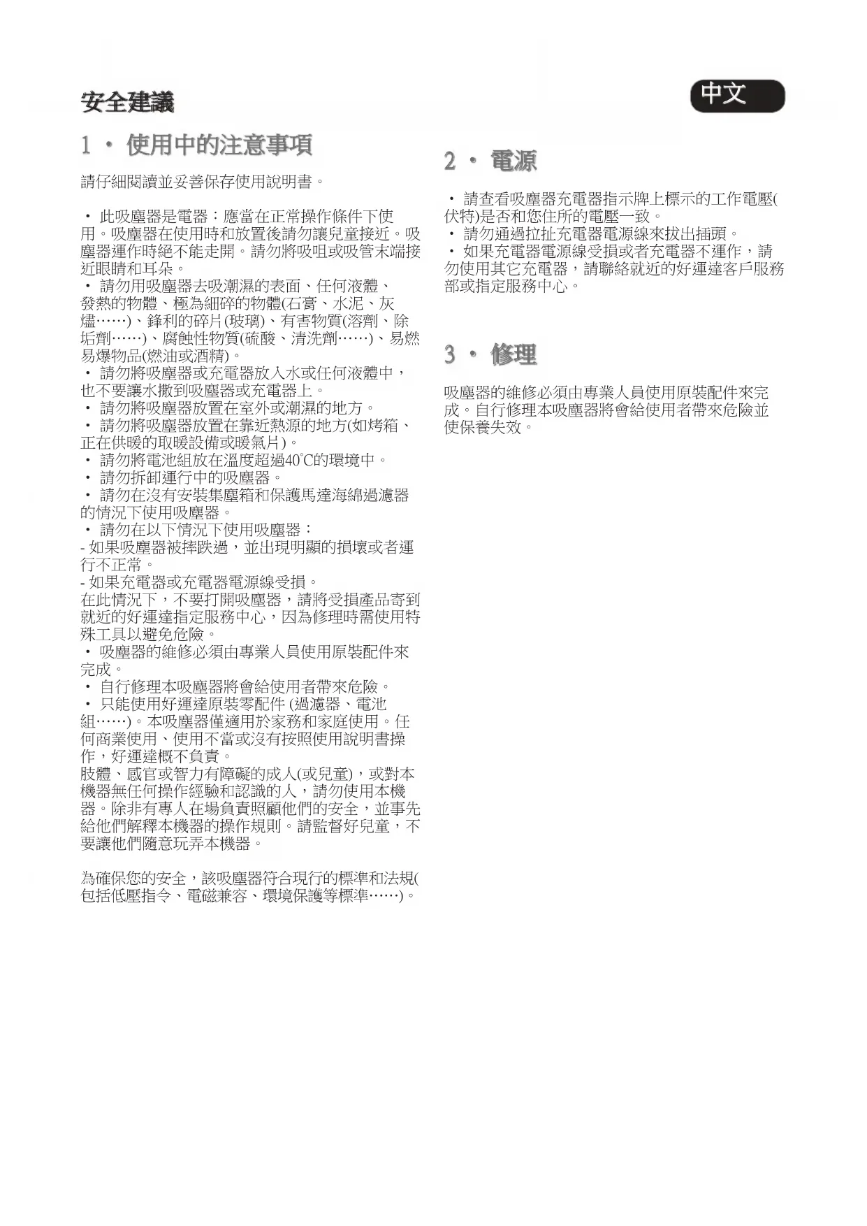 3 • 修理 吸塵器的維修必須由專業人員使用原裝配件來完 成。自行修理本吸塵器將會給使用者帶來危險並