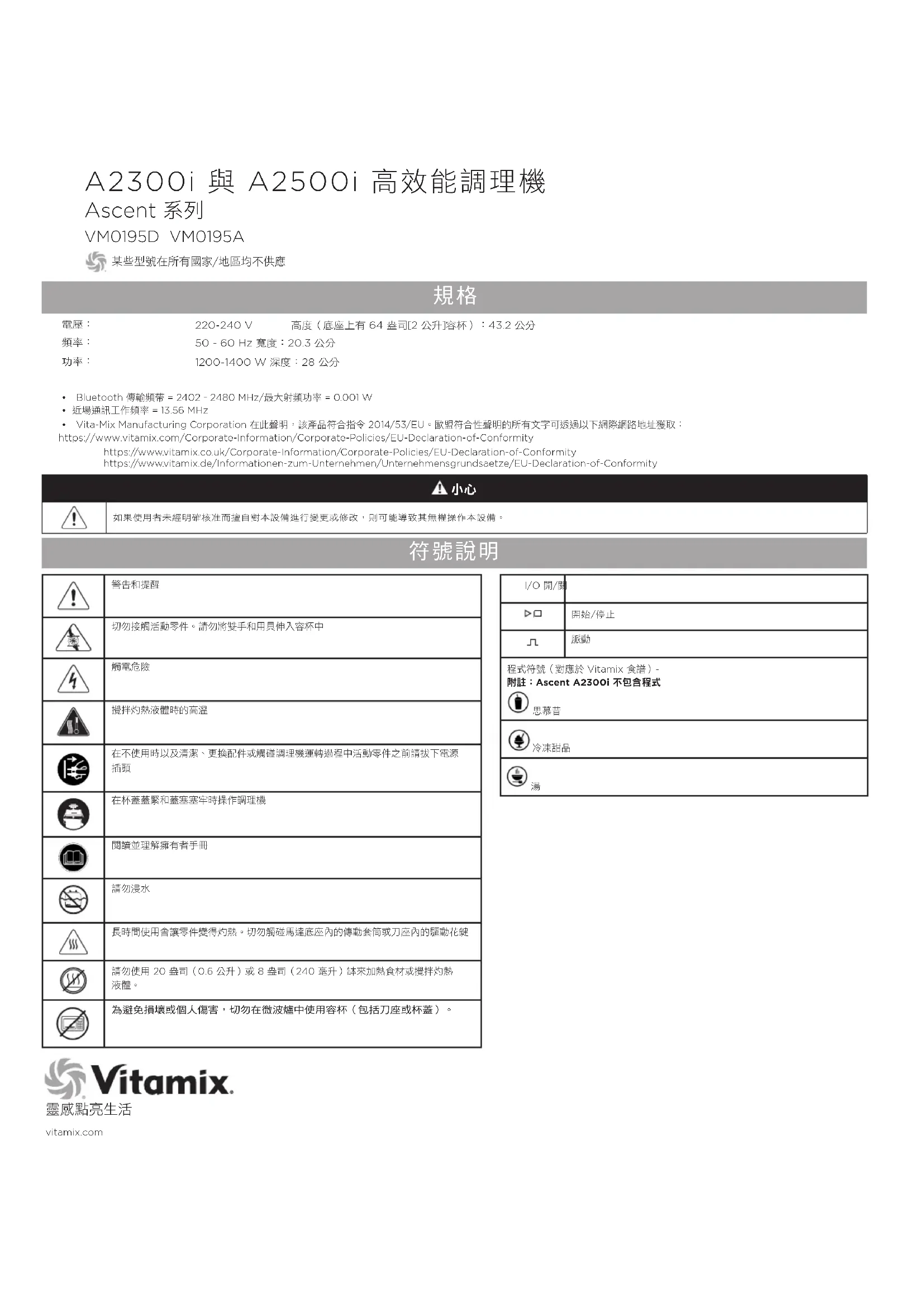)+852( 2881.8270 :A2300i 與 A2500i 高效能調理機 Ascent 系列 VM0185 警告和提醒切勿接觸活動零件。請勿將雙手和用具伸入容杯中 攪拌灼熱液體時的高溫在不使用時以及清潔、更換配件或觸碰調理機運轉過程中活動零件之前請拔下電源 在杯蓋蓋緊和蓋塞塞牢時操作調理機閱讀並理解擁有者手冊 長時間使用會讓零件變得灼熱。切勿觸碰馬達底座內的傳動套筒或刀座內的驅動花鍵 請勿使用 20 盎司(0.6 公升)或 8 盎司(240 毫升)缽來加熱食材或攪拌灼熱