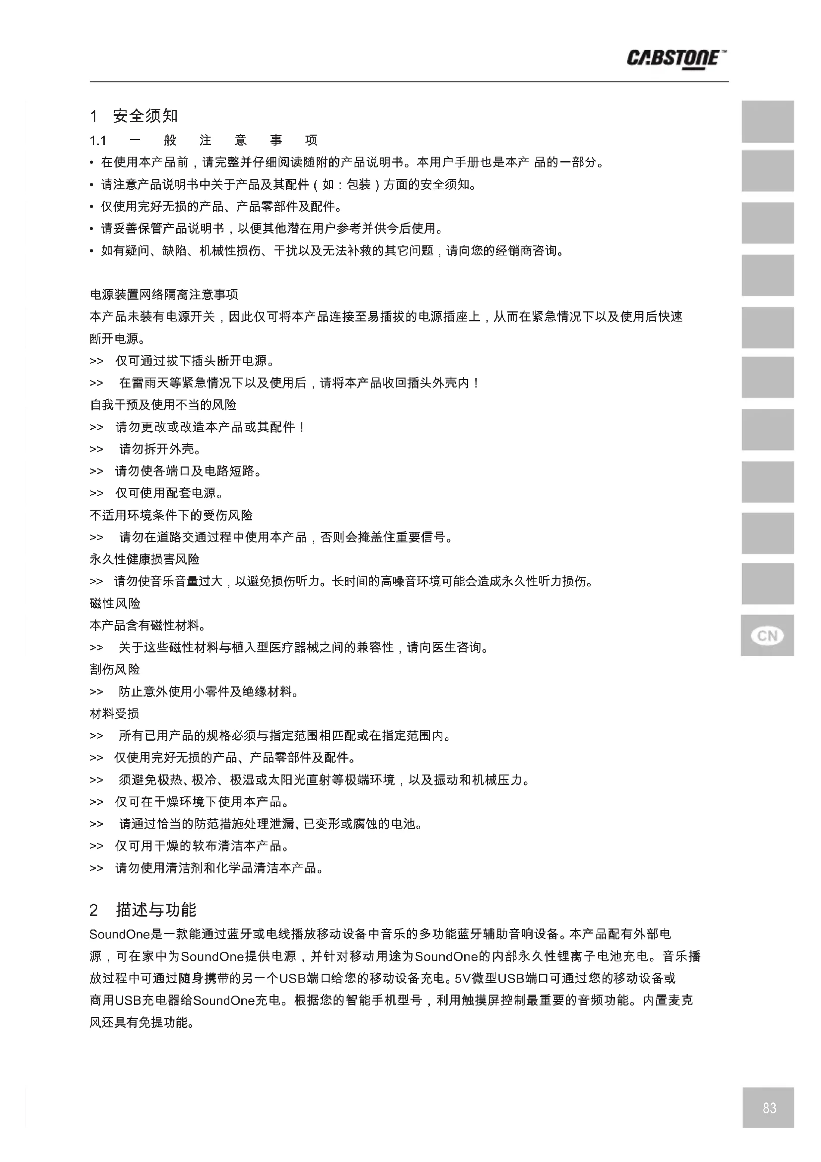 >> 所有已用产品的规格必须与指定范围相匹配或在指定范围内。 >> 仅使用完好无损的产品、产品零部件及配件。 >> 须避免极热、极冷、极湿或太阳光直射等极端环境,以及振动和机械压力。 >> 仅可在干燥环境下使用本产品。 >> 请通过恰当的防范措施处理泄漏、已变形或腐蚀的电池。 >> 仅可用干燥的软布清洁本产品。 >> 请勿使用清洁剂和化学品清洁本产品。 2 描 述 与 功 能 SoundOne是一款能通过蓝牙或电线播放移动设备中音乐的多功能蓝牙辅助音响设备。本产品配有外部电 源,可在家中为SoundOne提供电源,并针对移动用途为SoundOne的内部永久性锂离子电池充电。音乐播