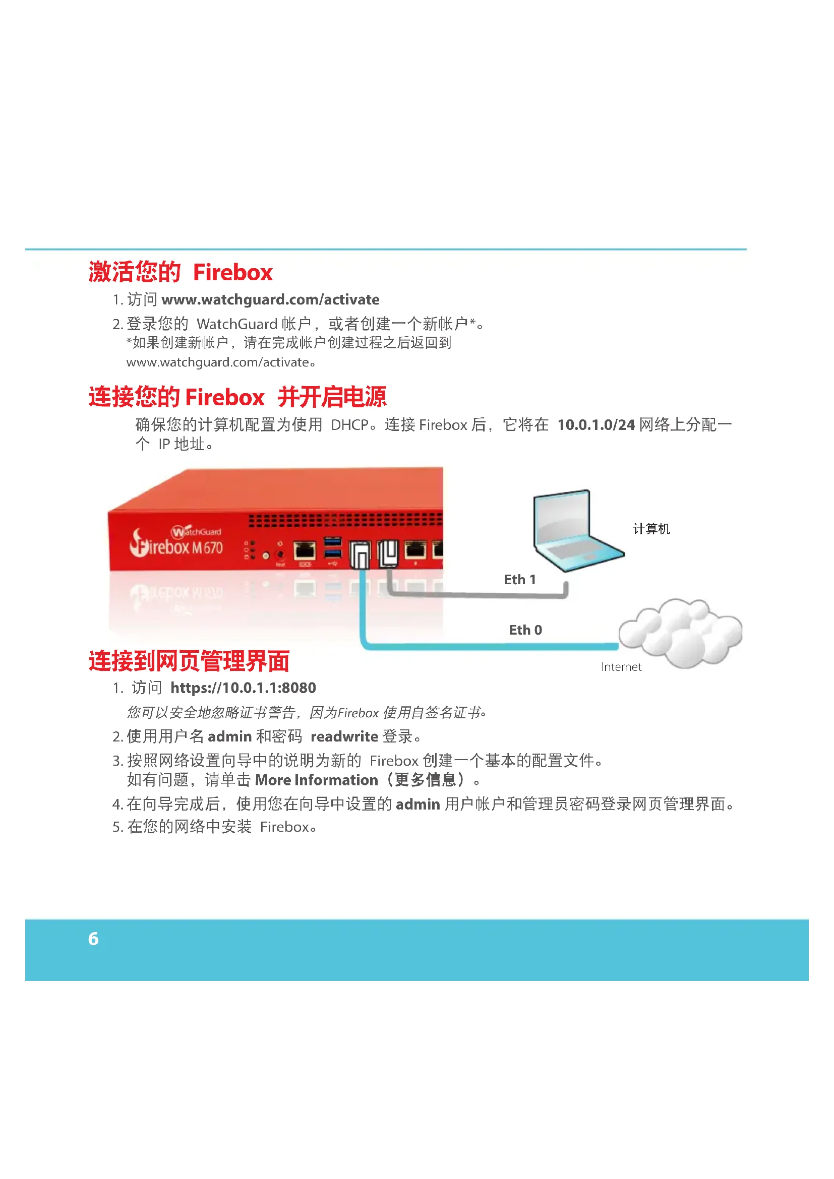*如果创建新帐户,请在完成帐户创建过程之后返回到 www.watchguard.com/activate。 连接您的 Firebox 并开启电源 确保您的计算机配置为使用 DHCP。连接 Firebox 后,它将在 10.0.1.0/24 网络上分配一 个 IP 地址。