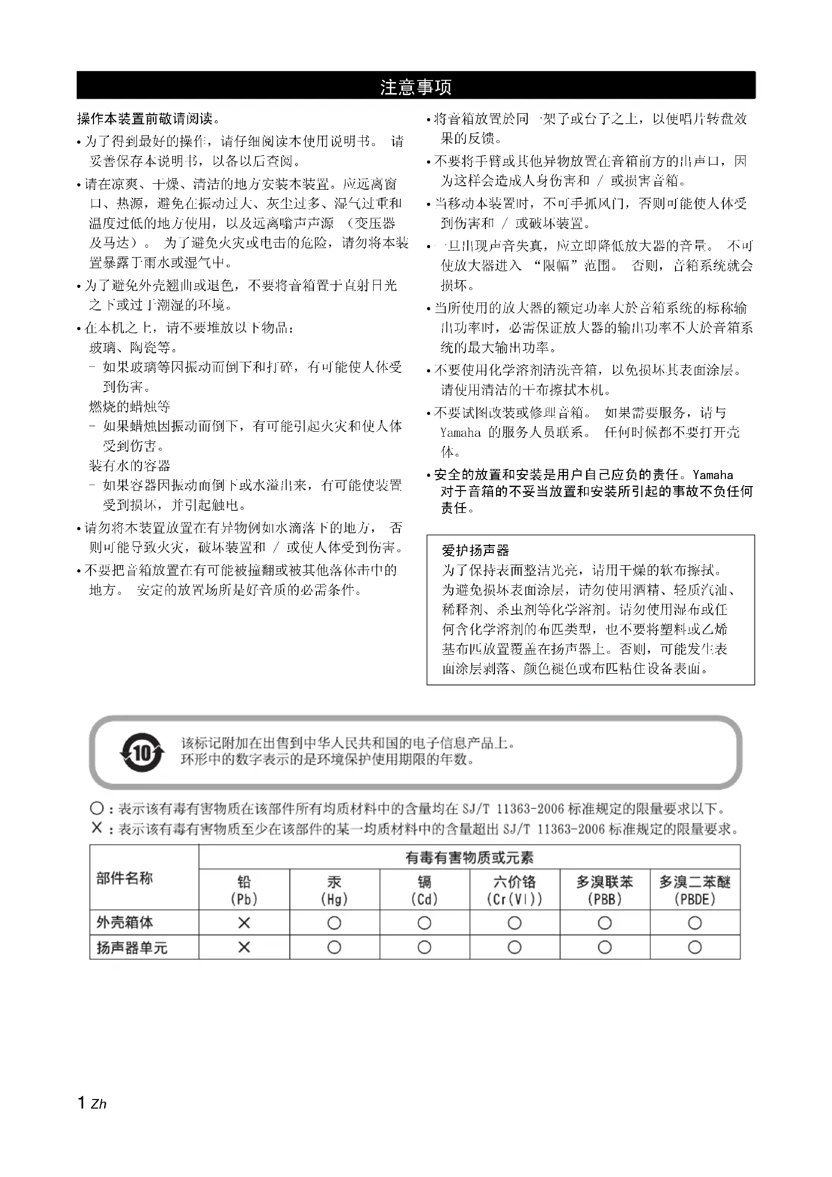 - 安全的放置和安装是用户自己应负的责任。Yamaha 对于音箱的不妥当放置和安装所引起的事故不负任何
