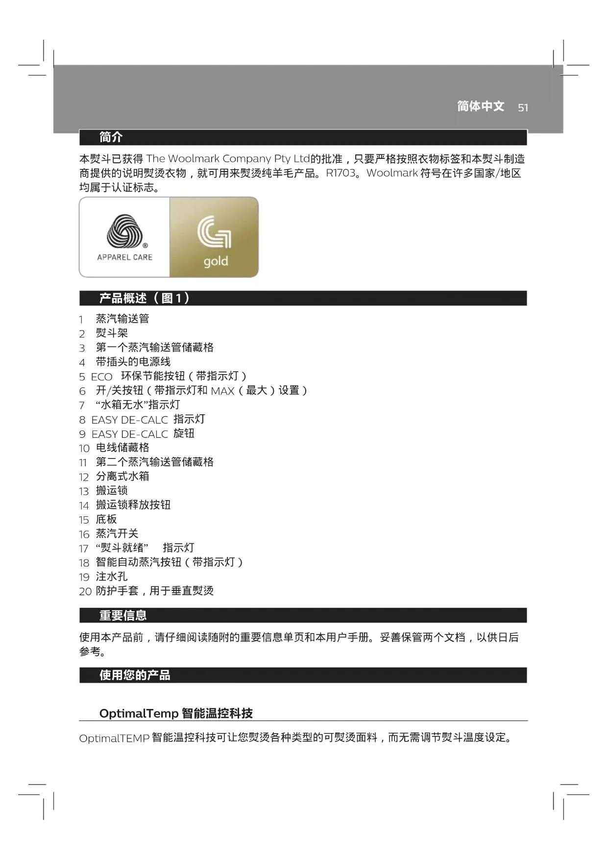 The Woolmark Company Pty Ltd 的批准,只要严格按照衣物标签和本熨斗制造 商提供的说明熨烫衣物,就可用来熨烫纯羊毛产品。 R1703