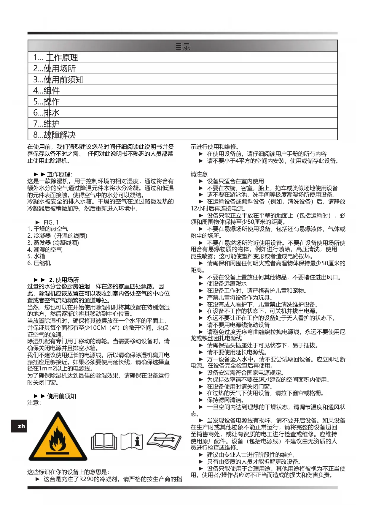1... 工作原理 2... 使用场所 3... 使用前须知 4... 组件 5... 操作 6... 排水 7... 维护 8... 故障解决en