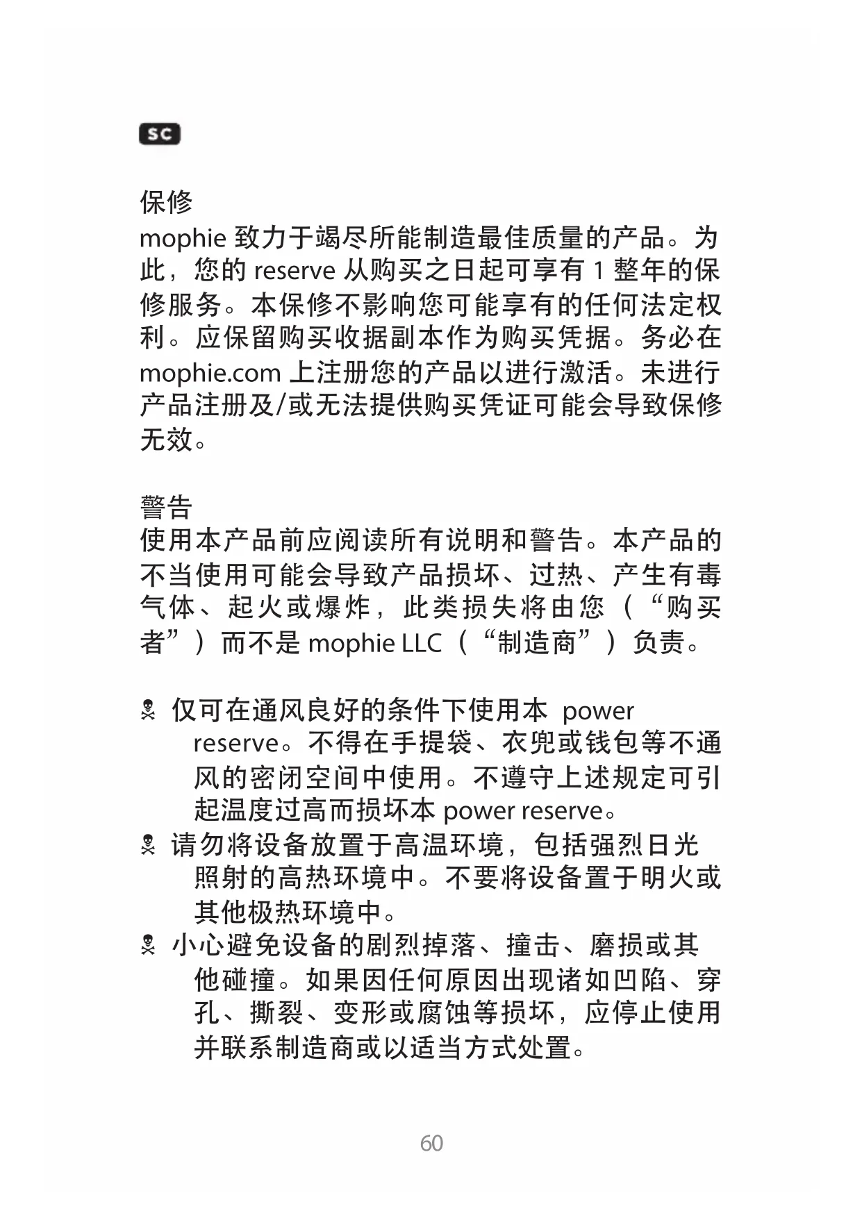 在mophie,我們專注於盡最大努力製造最優質產品。作為對此的支援,您的reserve享受從購買之日起為期1整年的保固服務。此保固服務不影響您可能有資格享有的任何法定權利。請保留您的購買收據作為購買證明。請謹記透過mophie.com註冊您的產品以啟動保養服務。未註冊您的產品和/或無法提供購買證明可能使保固失效。