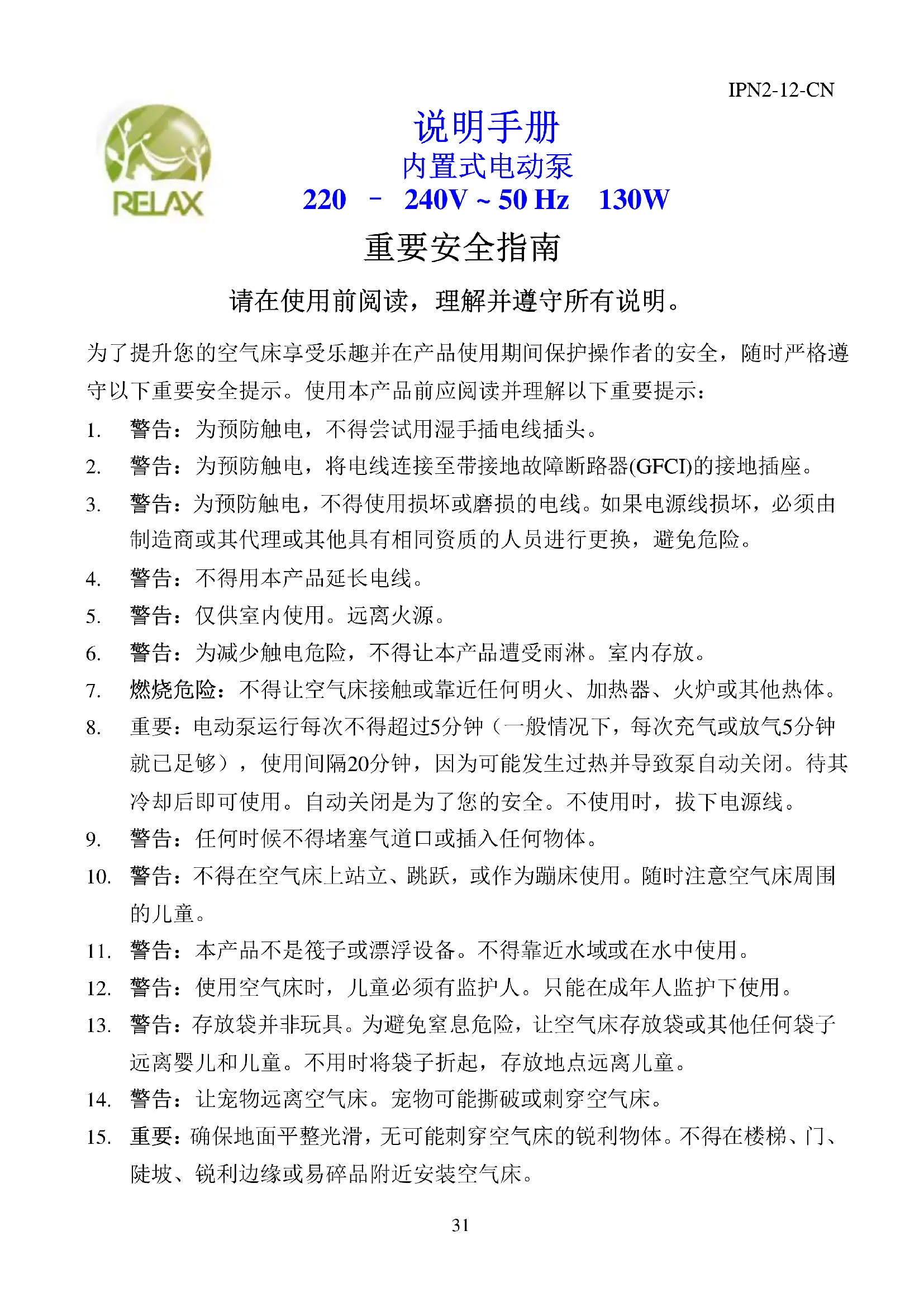10. 警告:不得在空气床上站立、跳跃,或作为蹦床使用。随时注意空气床周围