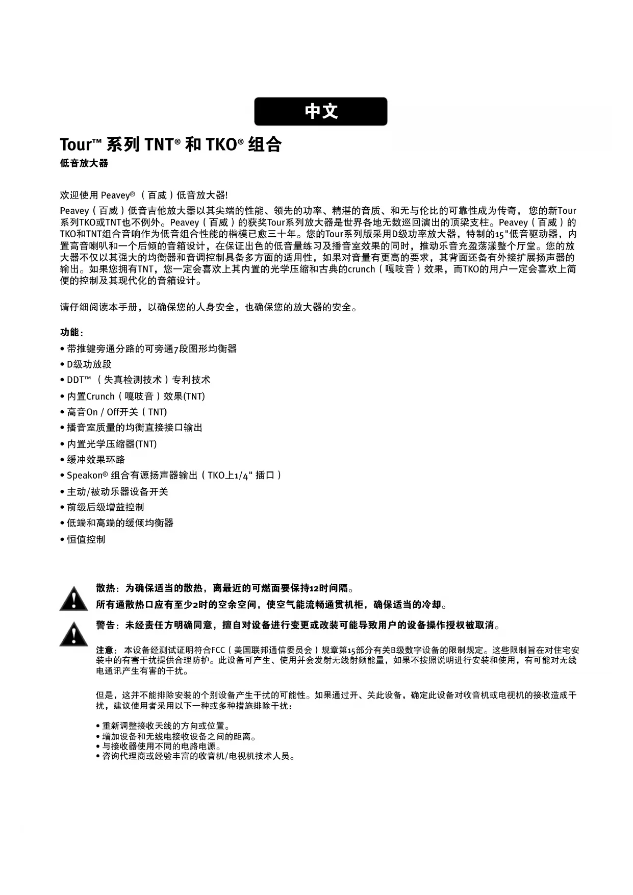 Peavey(百威)低音吉他放大器以其尖端的性能、领先的功率、精湛的音质、和无与伦比的可靠性成为传奇, 您的新Tour 系列TKO或TNT也不例外。Peavey(百威)的获奖Tour系列放大器是世界各地无数巡回演出的顶梁支柱。Peavey(百威)的 TKO和TNT组合音响作为低音组合性能的楷模已愈三十年。您的Tour系列版采用D级功率放大器,特制的15"低音驱动器,内 置高音喇叭和一个后倾的音箱设计,在保证出色的低音量练习及播音室效果的同时,推动乐音充盈荡漾整个厅堂。您的放 大器不仅以其强大的均衡器和音调控制具备多方面的适用性,如果对音量有更高的要求,其背面还备有外接扩展扬声器的 输出。如果您拥有TNT,您一定会喜欢上其内置的光学压缩和古典的crunch(嘎吱音)效果,而TKO的用户一定会喜欢上简 便的控制及其现代化的音箱设计。 请仔细阅读本手册,以确保您的人身安全,也确保您的放大器的安全。