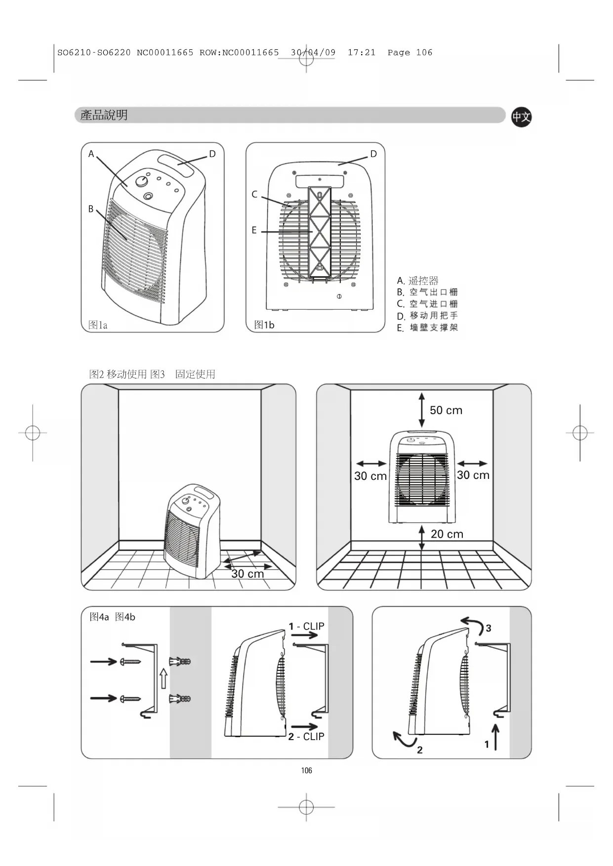 该暖风机只可安装在垂直墙面上,方向正确并遵守图3所指示的最小距离。 必须使用附送的支架将暖风机安装于墙上。 SO6210-SO6220 NC00011665 ROW:NC00011665 30/04/09 17:21 Page 107中文