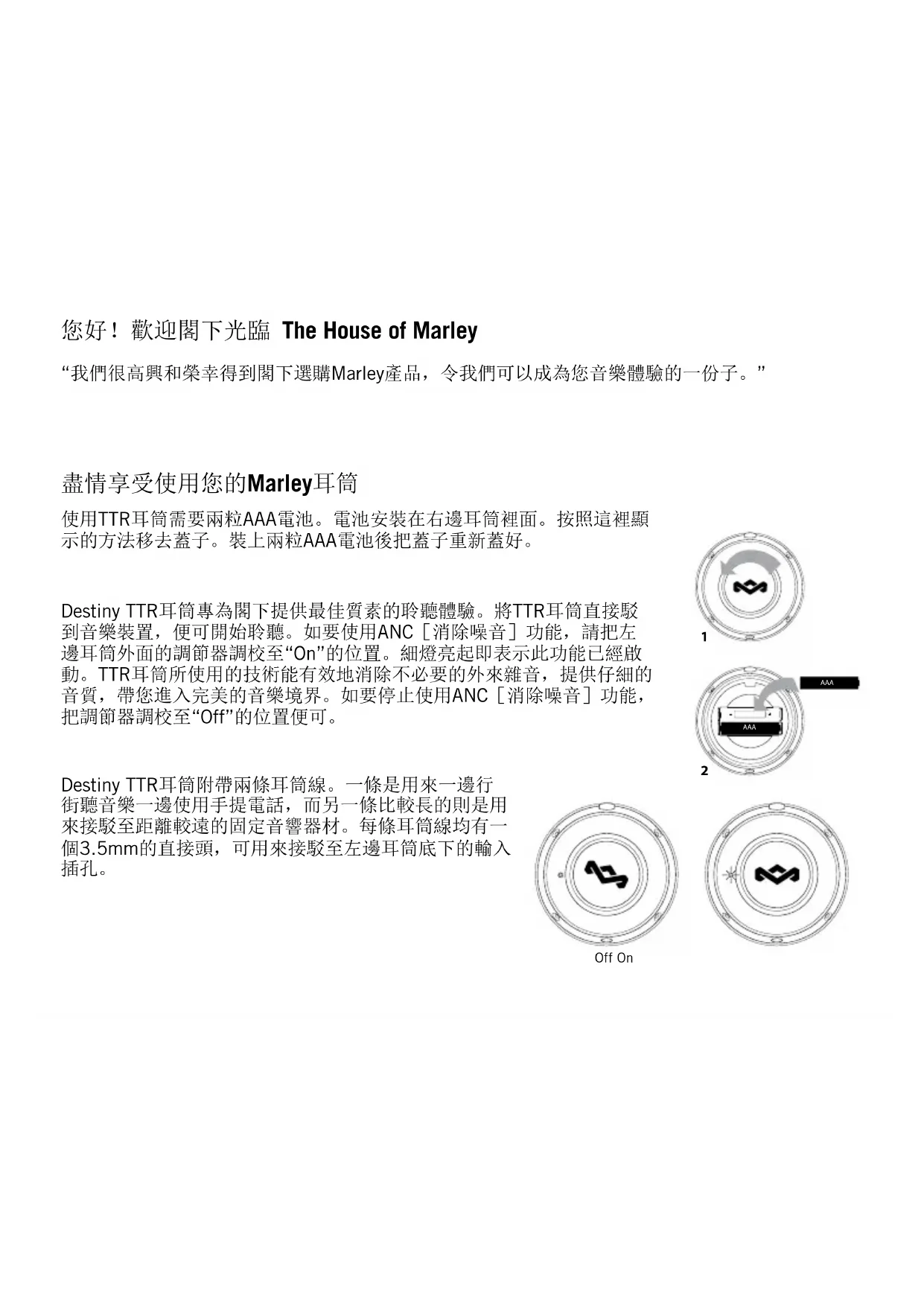.您好!歡迎閣下光臨 The House of Marley “我們很高興和榮幸得到閣下選購Marley產品,令我們可以成為您音樂體驗的一份子。” 盡情享受使用您的Marley耳筒 使用TTR耳筒需要兩粒AAA電池。電池安裝在右邊耳筒裡面。按照這裡顯 示的方法移去蓋子。裝上兩粒AAA電池後把蓋子重新蓋好。 Destiny TTR耳筒專為閣下提供最佳質素的聆聽體驗。將TTR耳筒直接駁 到音樂裝置,便可開始聆聽。如要使用ANC[消除噪音]功能,請把左 邊耳筒外面的調節器調校至“On”的位置。細燈亮起即表示此功能已經啟 動。TTR耳筒所使用的技術能有效地消除不必要的外來雜音,提供仔細的 音質,帶您進入完美的音樂境界。如要停止使用ANC[消除噪音]功能, 把調節器調校至“Off”的位置便可。 Destiny TTR耳筒附帶兩條耳筒線。一條是用來一邊行 街聽音樂一邊使用手提電話,而另一條比較長的則是用 來接駁至距離較遠的固定音響器材。每條耳筒線均有一 個3.5mm的直接頭,可用來接駁至左邊耳筒底下的輸入