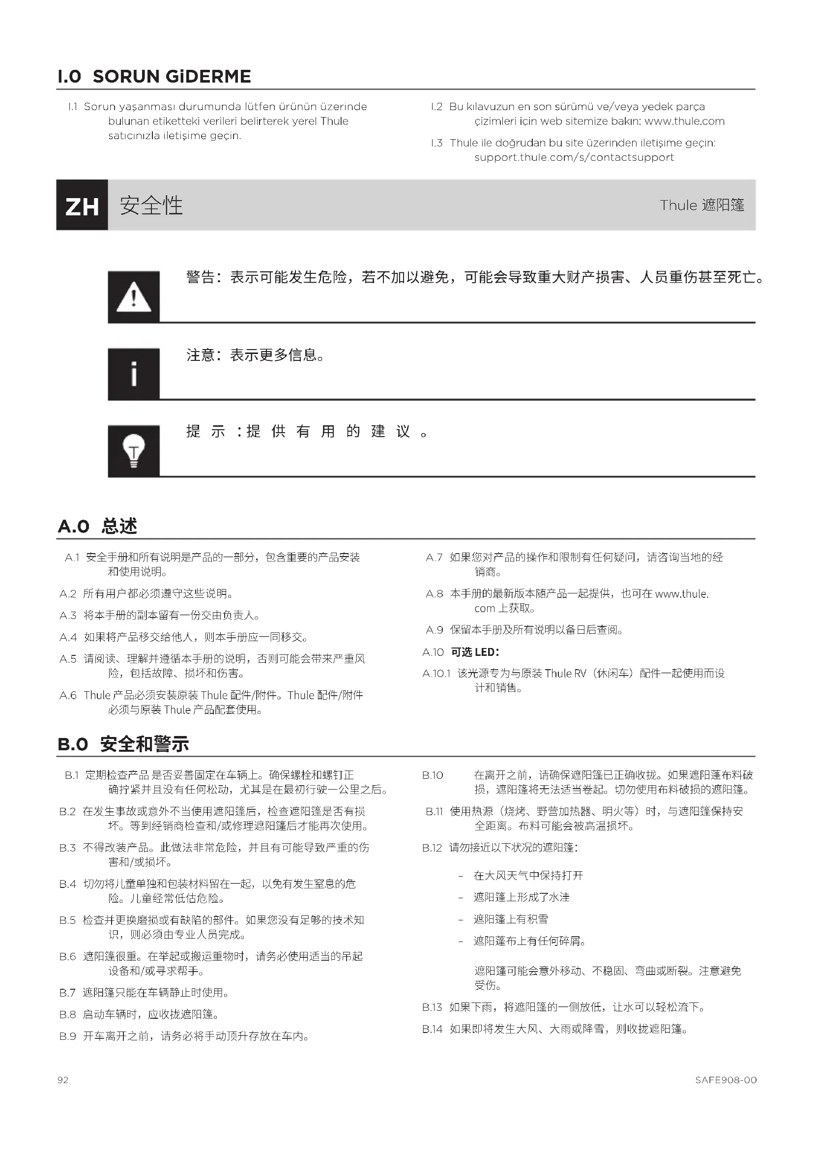 A.2 所有用户都必须遵守这些说明。 A.3 将本手册的副本留有一份交由负责人。 A.4 如果将产品移交给他人,则本手册应一同移交。 A.5 请阅读、理解并遵循本手册的说明,否则可能会带来严重风 险,包括故障、损坏和伤害。 A.6 Thule 产品必须安装原装 Thule 配件/附件。Thule 配件/附件 必须与原装 Thule 产品配套使用。 A.7 如果您对产品的操作和限制有任何疑问,请咨询当地的经