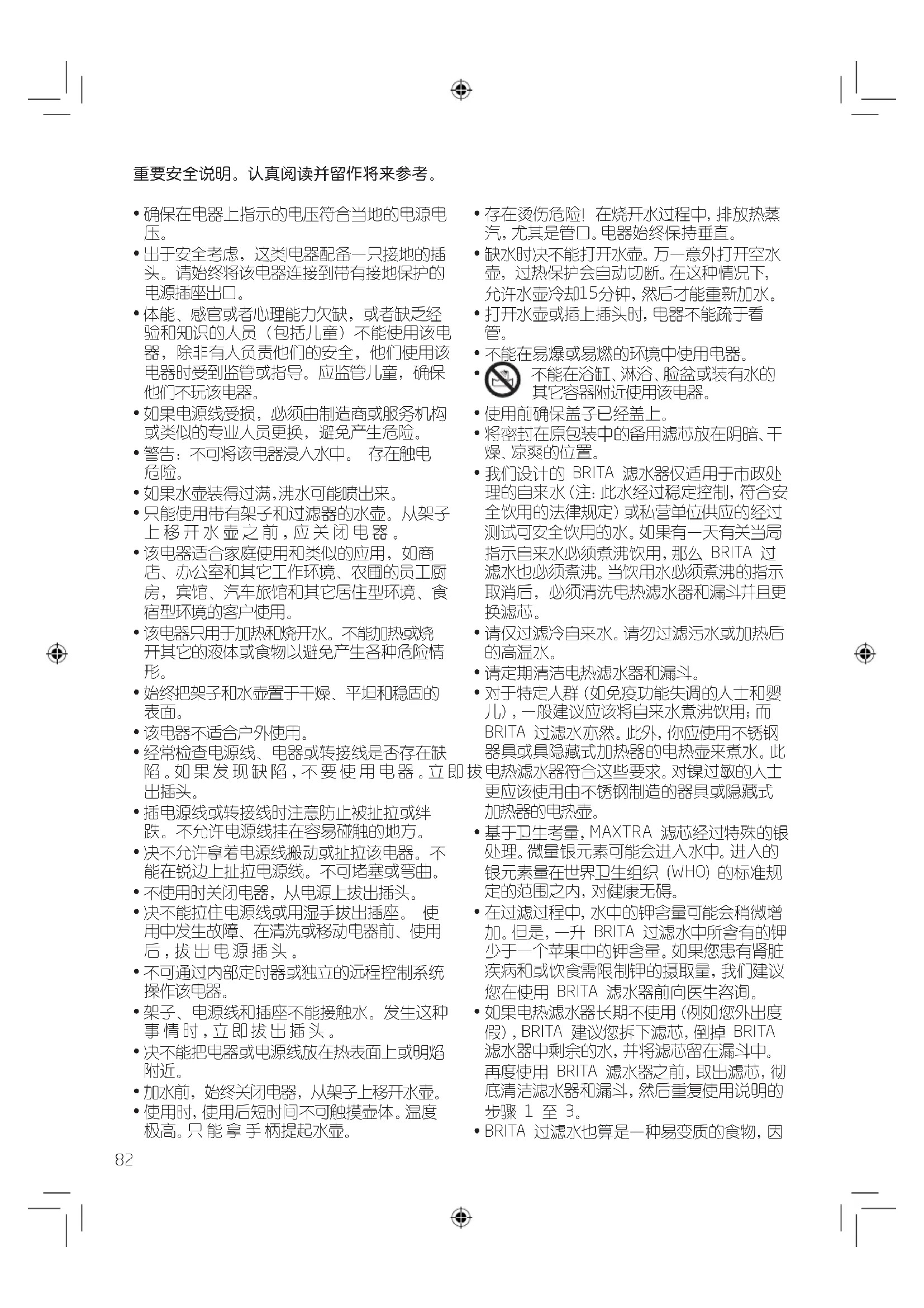 - 在过滤器漏斗或BRITA MAXTRA滤筒没有入位之前决不能使用水壶。
