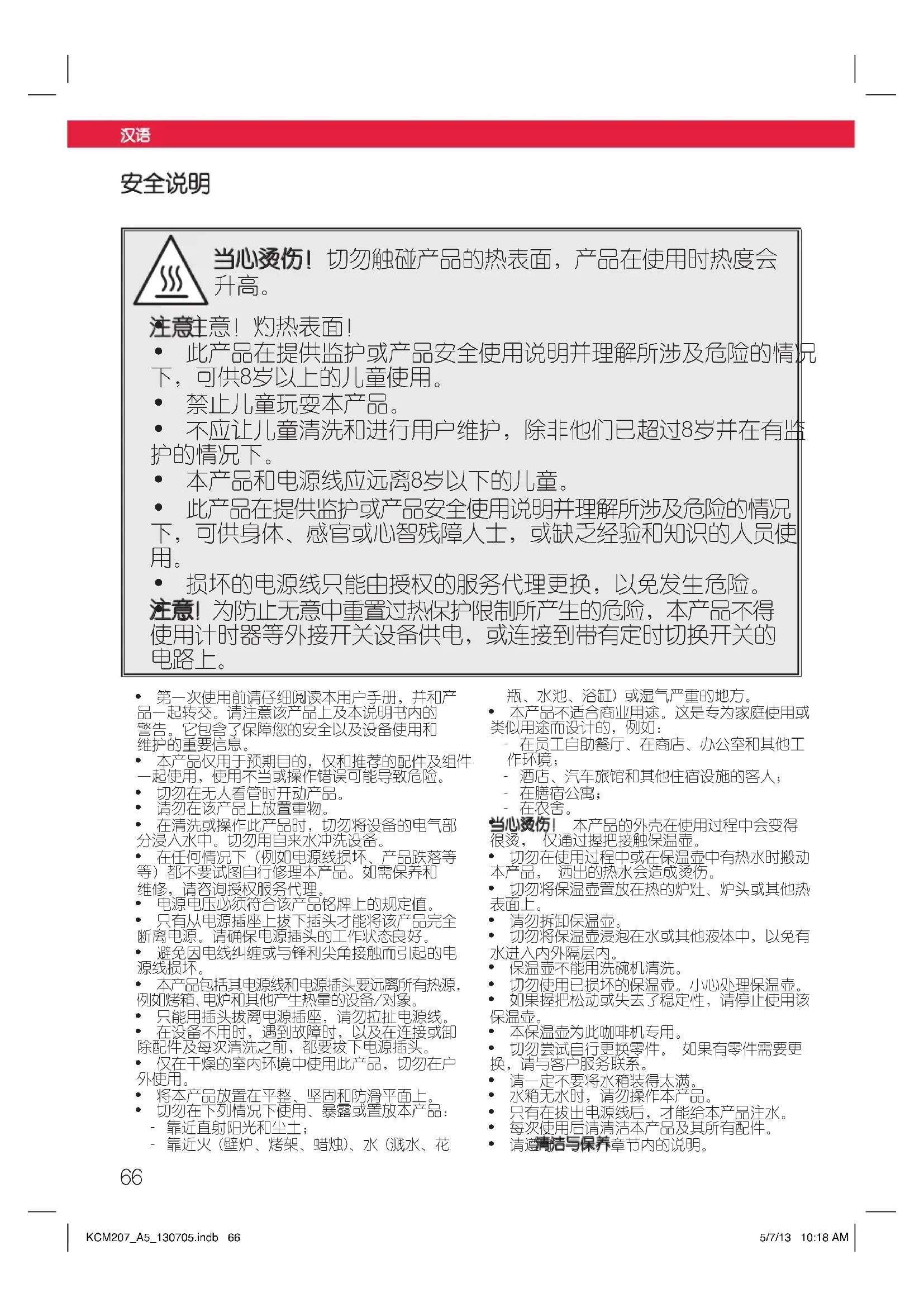 当心烫伤!•本产品的外壳在使用过程中会变得 很烫,•仅通过握把接触保温壶。