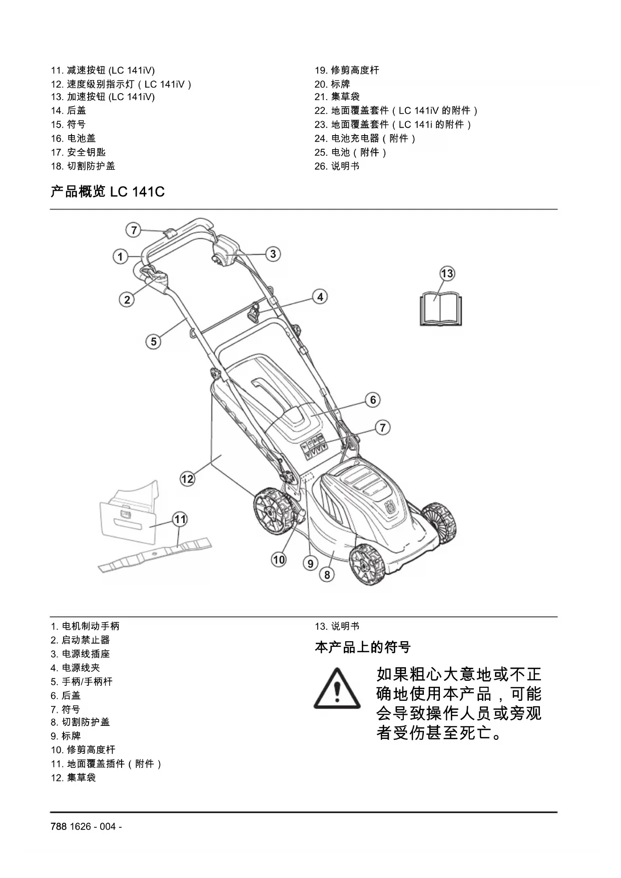 1626 - 004 - 791• 如果刀片碰撞到任何异物或者 发生振动,请立即关闭本产 品。停止电机,将安全钥匙转 至 0,拆下电池(型号 LC 141iV 和 LC 141i)或断开 电源线(型号 LC 141C)。检 查本产品是否损坏。维修损坏 的地方或让授权的保养厂执行