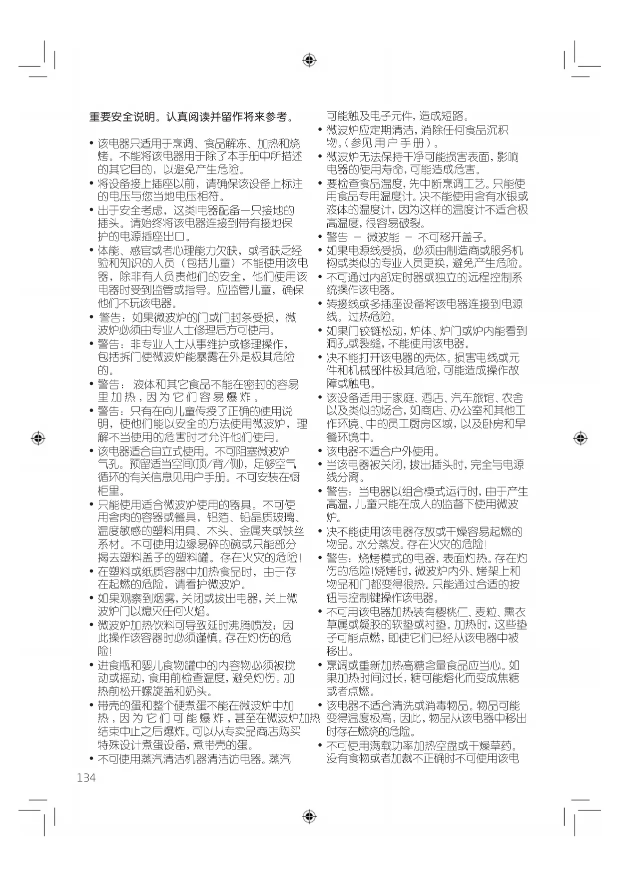 - 警告: 烧烤模式的电器,表面灼热 。存 在 灼 伤的危险!烧烤时,微波炉内外 、烤 架上和 物品和门都变得很热 。只 能 通过合适的按 钮与控制键操作该电器。