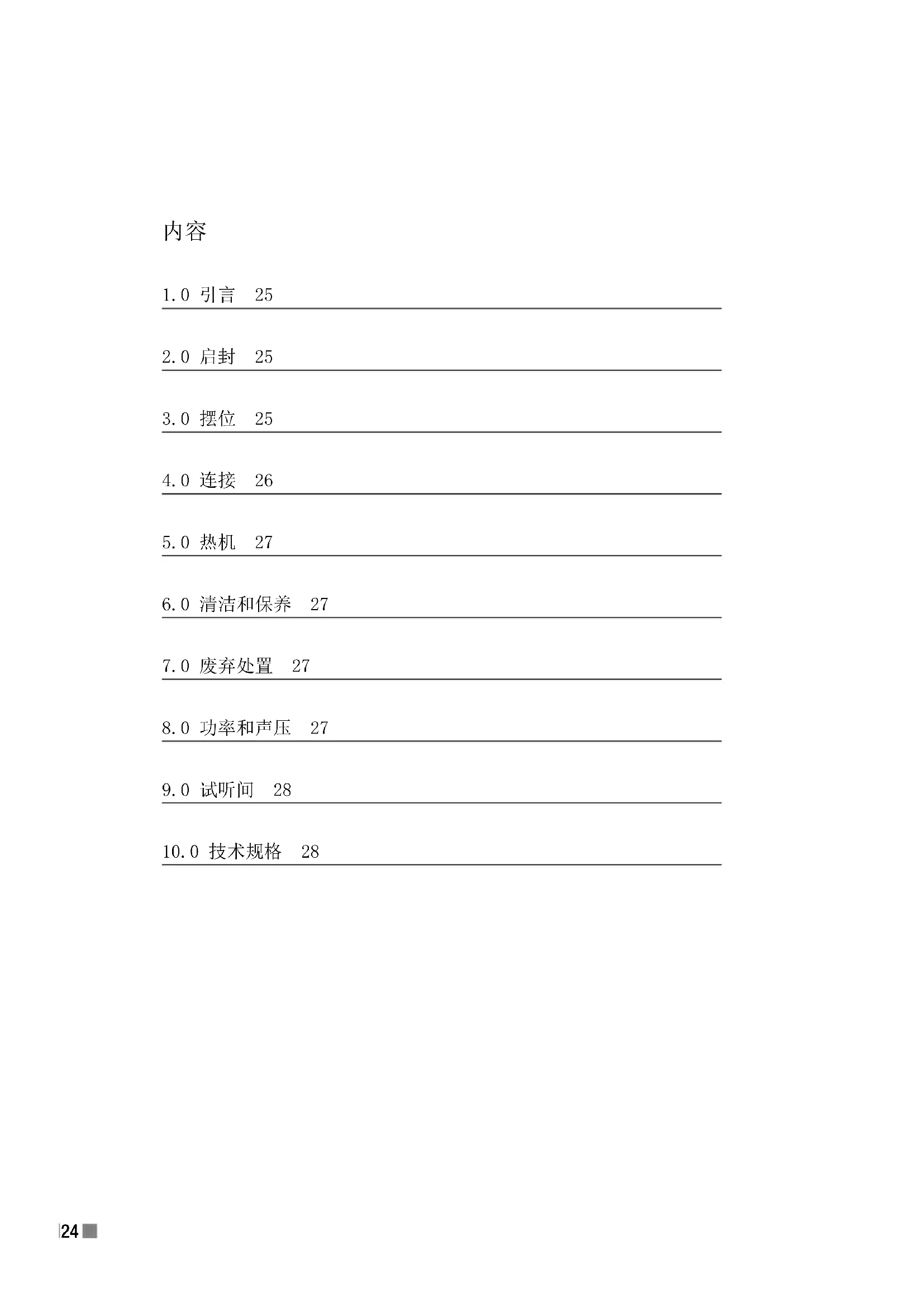 就像机械系统需要试运行一样,音箱也需要一段热机时间。新购音箱在初期使用过程中, 音质会逐步提高。热机时间主要取决于使用次数和播放音量,但至少需播放100个小时后 方可达到最佳性能。与其他机械系统不同,规范而有规律地使用音箱甚至还能延长其使用