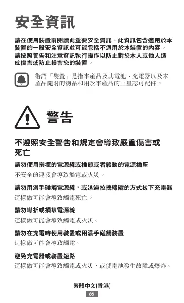 請在使用裝置前閱讀此重要安全資訊。此資訊包含適用於本 裝置的一般安全資訊並可能包括不適用於本裝置的內容。 請按照警告和注意資訊執行操作以防止對您本人或他人造 成傷害或防止損害您的裝置。 術語「裝置」是指本產品及其電池、充電器以 及本產品的隨附項目和用於本產品的三星核可