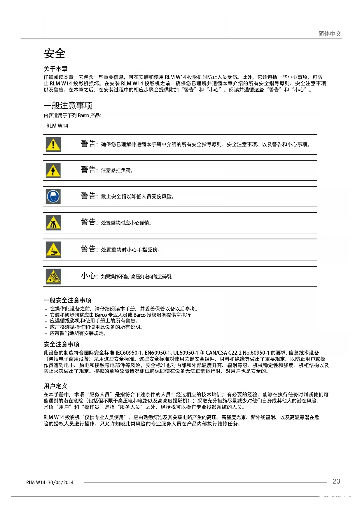 此设备的制造符合国际安全标准 IEC60950-1、EN60950-1、UL60950-1 和 CAN/CSA C22.2 No.60950-1 的要求,信息技术设备 (包括电子商用设备)采用这些安全标准。这些安全标准对使用关键安全组件、材料和绝缘等做出了重要规定,以防止用户或操作员遭到电击、触电和接触带电部件等风险。安全标准也对内部和外部温度升高、辐射等级、机械稳定性和强度、机柜结构以及防止火灾做出了规定。模拟的单项故障情况测试确保即使在设备无法正常运行时,对用户也是安全的。 在本手册中,术语“服务人员”是指符合下述条件的人员:经过相应的技术培训;有必要的经验,能够在执行任务时判断他们可能遇到的潜在危险(包括但不限于高压电和电路以及高亮度投影机);采取充分措施尽量减少对他们自身或其他人的潜在风险。术语“用户”和“操作员”是指“服务人员”之外、经授权可以操作专业投影系统的人员。RLM W14 投影机“仅供专业人员使用”,应由熟悉灯泡及其关联电路产生的高压、高强度光束、紫外线辐射、以及高温等潜在危险的授权人员进行操作。只允许知晓此类风险的专业服务人员在产品内部执行维修任务。RLM W14 30/04/2014