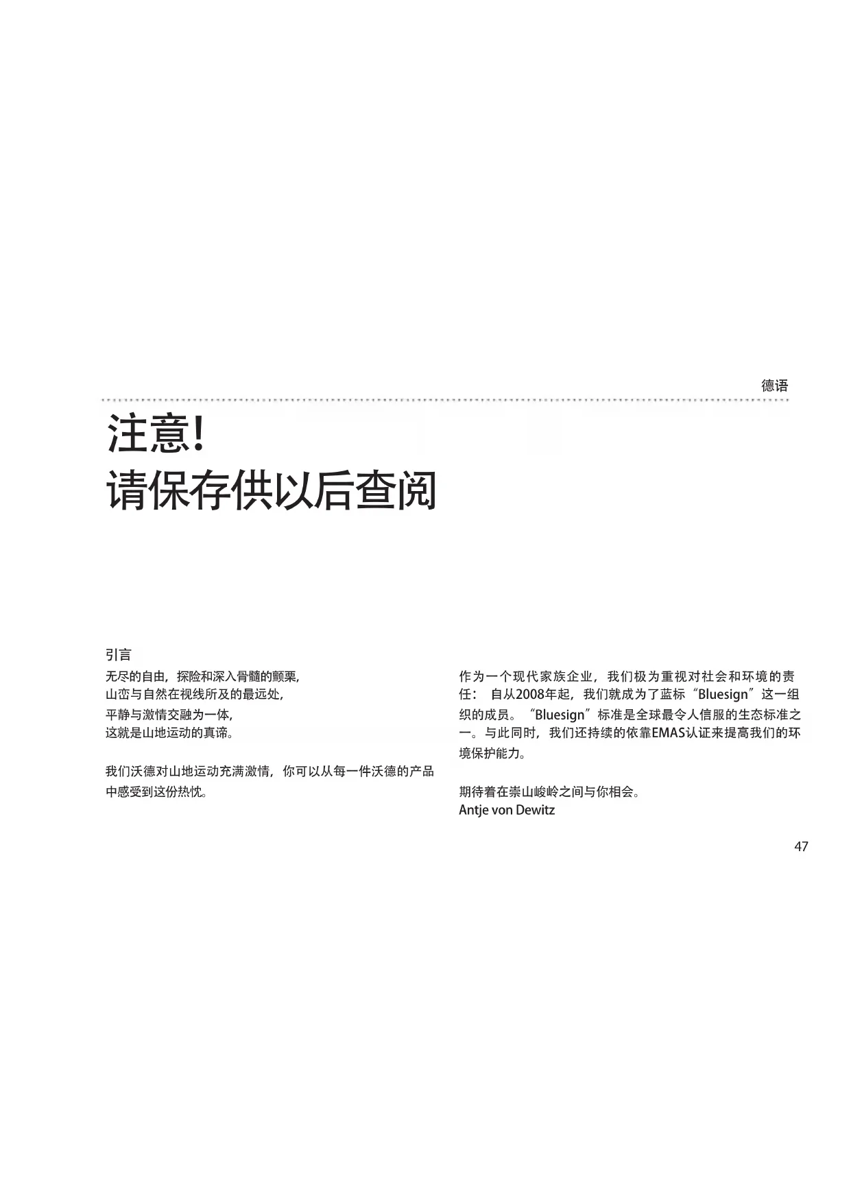 作为一个现代家族企业,我们极为重视对社会和环境的责 任: 自从2008年起,我们就成为了蓝标“Bluesign”这一组 织的成员。“Bluesign”标准是全球最令人信服的生态标准之 一。与此同时,我们还持续的依靠EMAS认证来提高我们的环